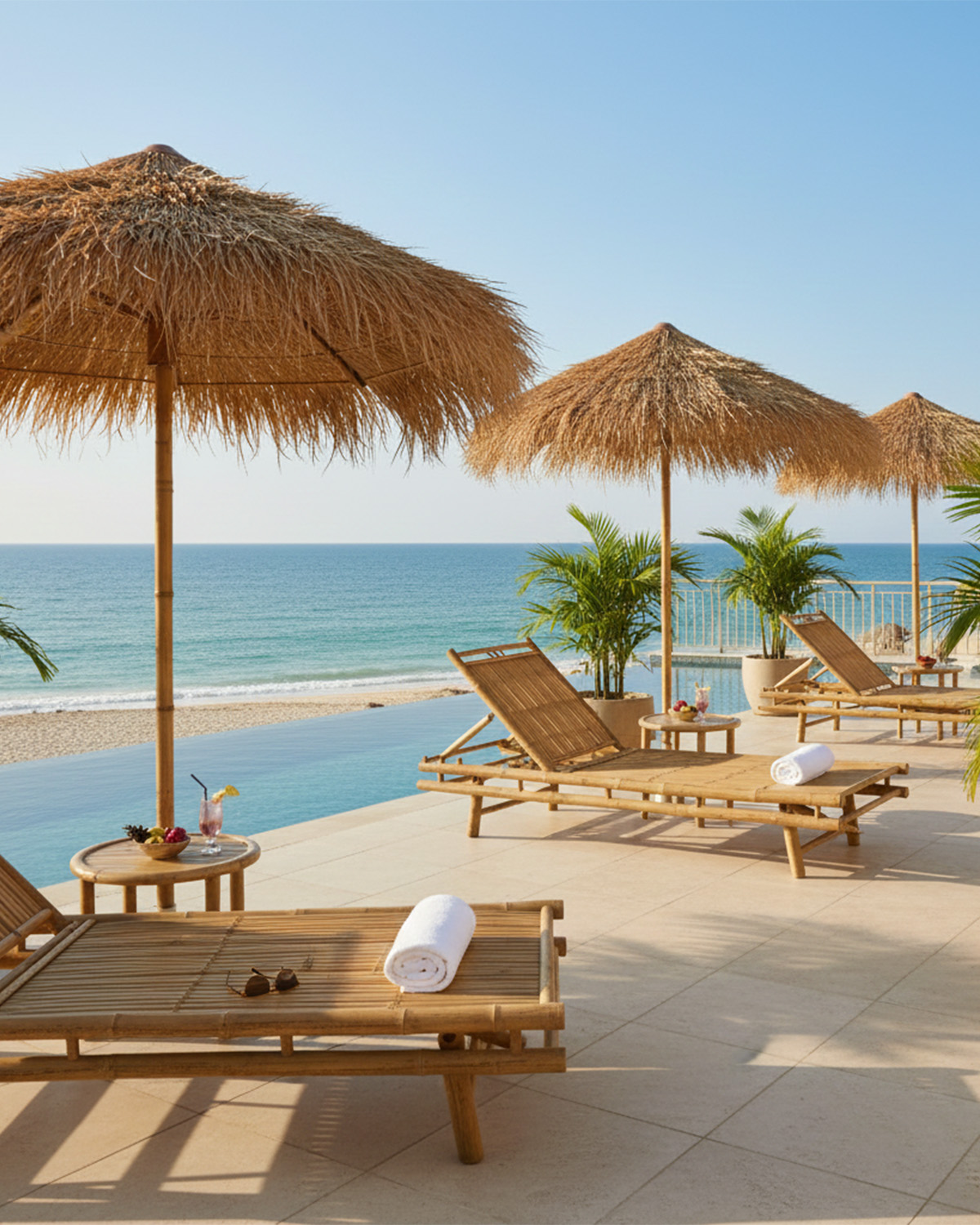 Skapa en avslappnad och exklusiv semesterkänsla hemma med detta parasoll i naturmaterial. Den fransiga designen ger ett mjukt, bohemiskt uttryck som passar perfekt vid poolen, på terrassen eller i loungemiljöer. Parasollen blir en stilfull detalj som både ger skugga och lyfter hela uteplatsen med sin naturliga och trendiga look. Ett måste för dig som vill skapa sommarens finaste miljö – med känsla av beach club och medelhav. Passar lika bra privat som i hotell-, restaurang- och poolmiljöer. Material: Bambustång + tak av palmblad. Diameter: 150 cm. Höjd: 240 cm