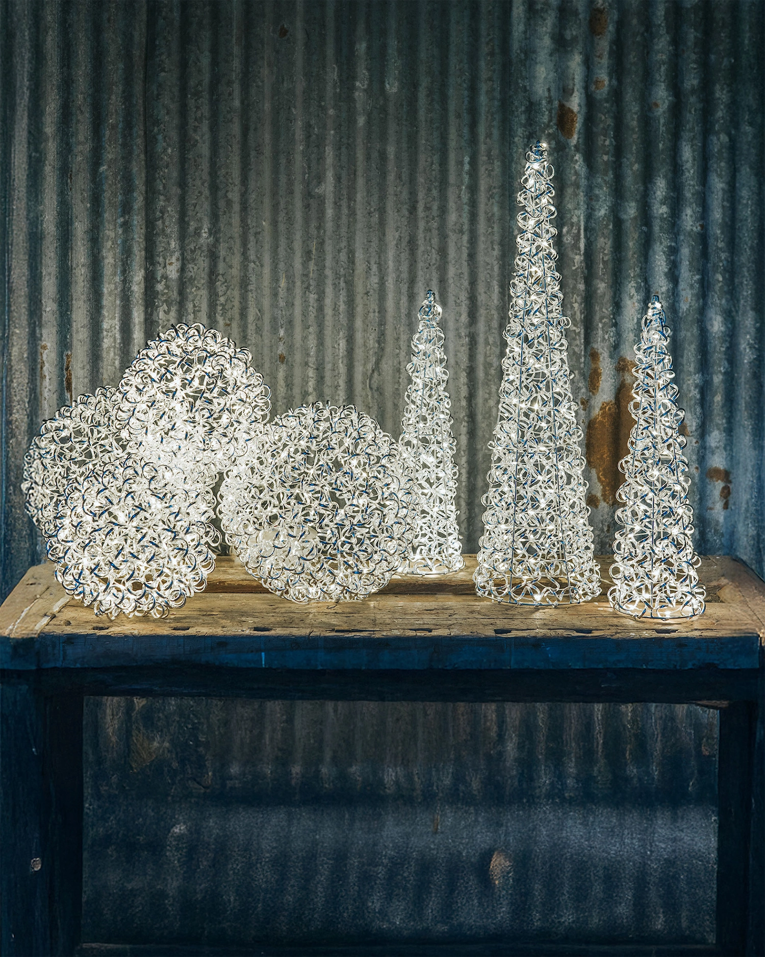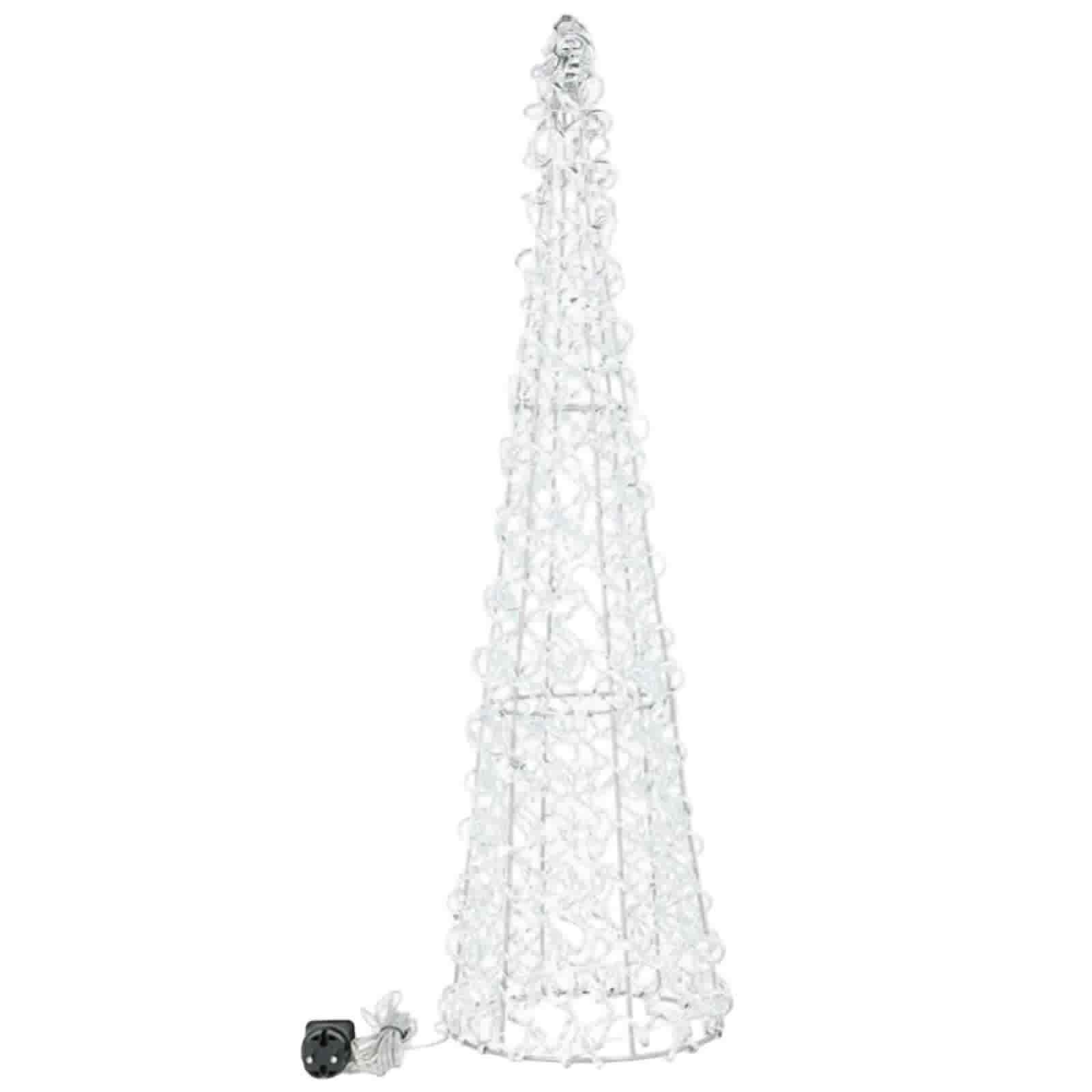 Denna gran har en elegant stomme gjord av aluminium, vilket ger den en modern och stilren design. Den är dekorerad med en transparent LED-slinga som består av 120 lampor som avger ett varmt ljus, vilket skapar en inbjudande och mysig atmosfär. Sladden är 5 meter lång, vilket ger flexibilitet vid placering och anslutning till ett eluttag. Granen har en minimalistisk och samtida känsla.