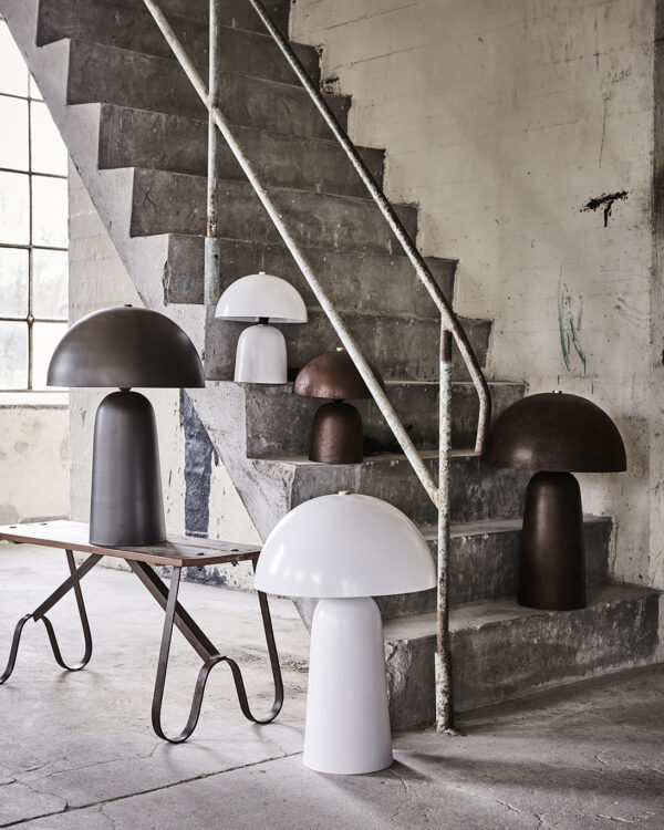 Trendig vit bordslampa med en minimalistisk design. Lampan har en rund, kupolformad skärm som liknar en svamp, vilket ger den ett modernt och stilrent utseende. Basen är cylindrisk och något bredare vid botten, vilket ger stabilitet. En svart sladd syns på vänster sida av lampan. Lampans enkla och eleganta form gör den lämplig för olika inredningsstilar. Mått: Material: Järn. E27, G45/P45 klotlampa, max. 25 Watt. EU stickkontakt inkluderad.