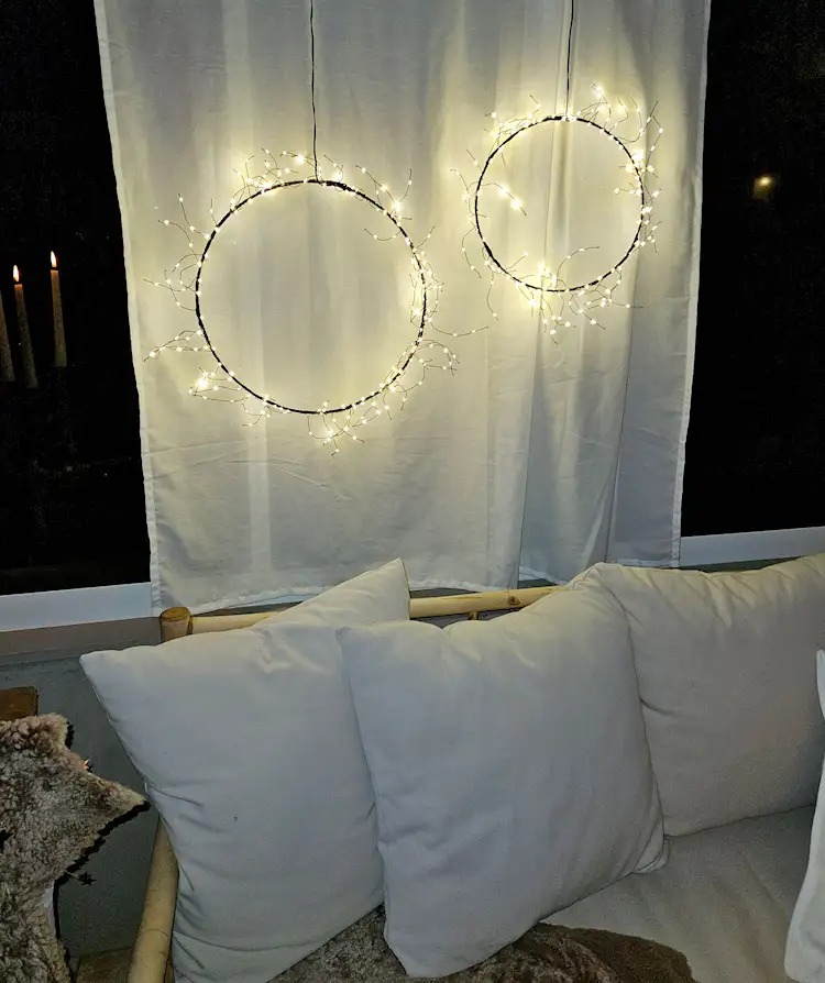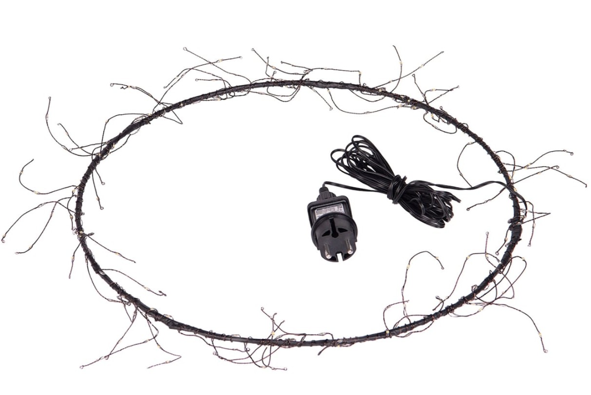 En vacker LED-ring med ljusslinga. Vackert att hänga flera stycken över ett bord men även med en ensam boll hängandes i ett fönster. Denna boll fumkar för utomhusbruk, vilket gör den perfekta belysningen att ha ute på terrassen, balkongen eller i trädgården. Snyggt är också att hantera bollen ovan liggande på en kruka ute. Vackert och stilrent. Storlek: Ø40 cm 192LED-lampor. Material: Plast/Metall IP44 Vikt: 0.19