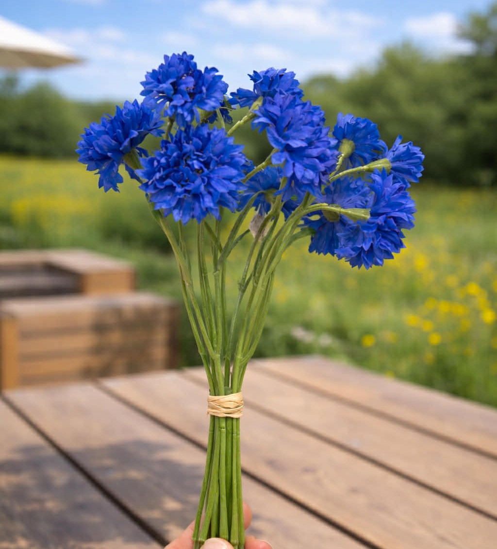 Ett vackert knippe blåklint, ca 30 cm högt, bundet med ett naturfärgat band som ger en enkel och rustik känsla. De intensivt blå blommorna har fylliga, mjuka kronblad som skapar en livfull och somrig bukett. De smala gröna stjälkarna ger en naturlig och lätt känsla, perfekt för mindre vaser eller som dekorativ detalj. Blåklinten är en klassisk nordisk sommarblomma som för tankarna till blommande ängar och ljusa sommardagar.
