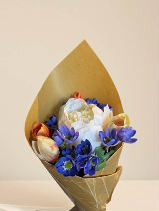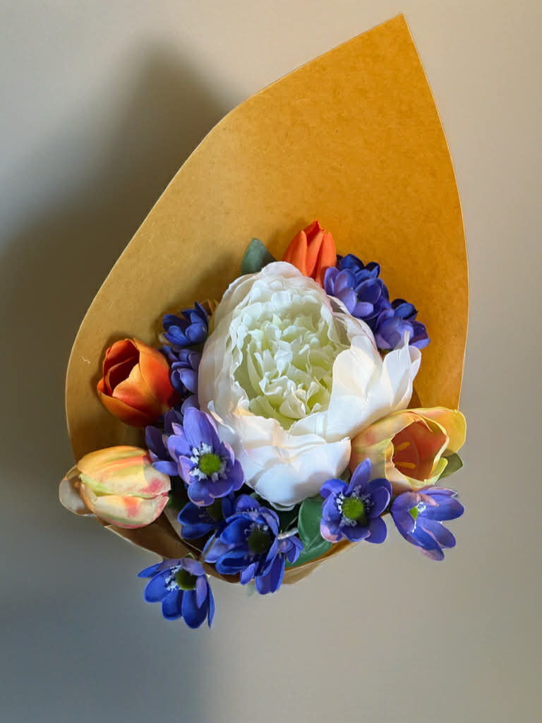 Ett naturtroget och färgstarkt arrangemang med en stor, fyllig vit pion i centrum, omgiven av mjukt orange tulpaner och livliga blå/lila småblommor. Kombinationen ger en elegant och vårig känsla, medan det varma pappret ramar in helheten på ett stilrent sätt.