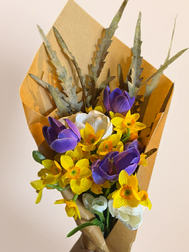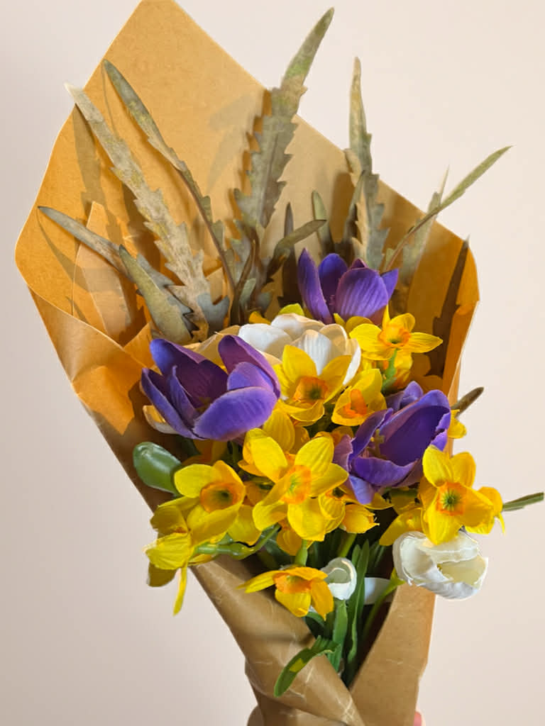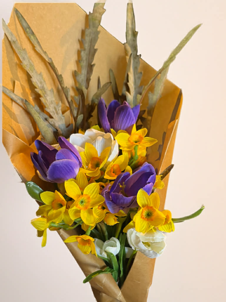 Buketten är en konstgjord, vårinspirerad och skapad med en livlig färgkombination av gult, vitt och lila och består av typiska påsk- och vårblommor. Den domineras av gula och vita påskliljor som ger ett friskt och soligt intryck, medan lila krokusblommor bryter av och skapar kontrast. Tillsammans bildar de ett klassiskt uttryck av vår- och påsk.