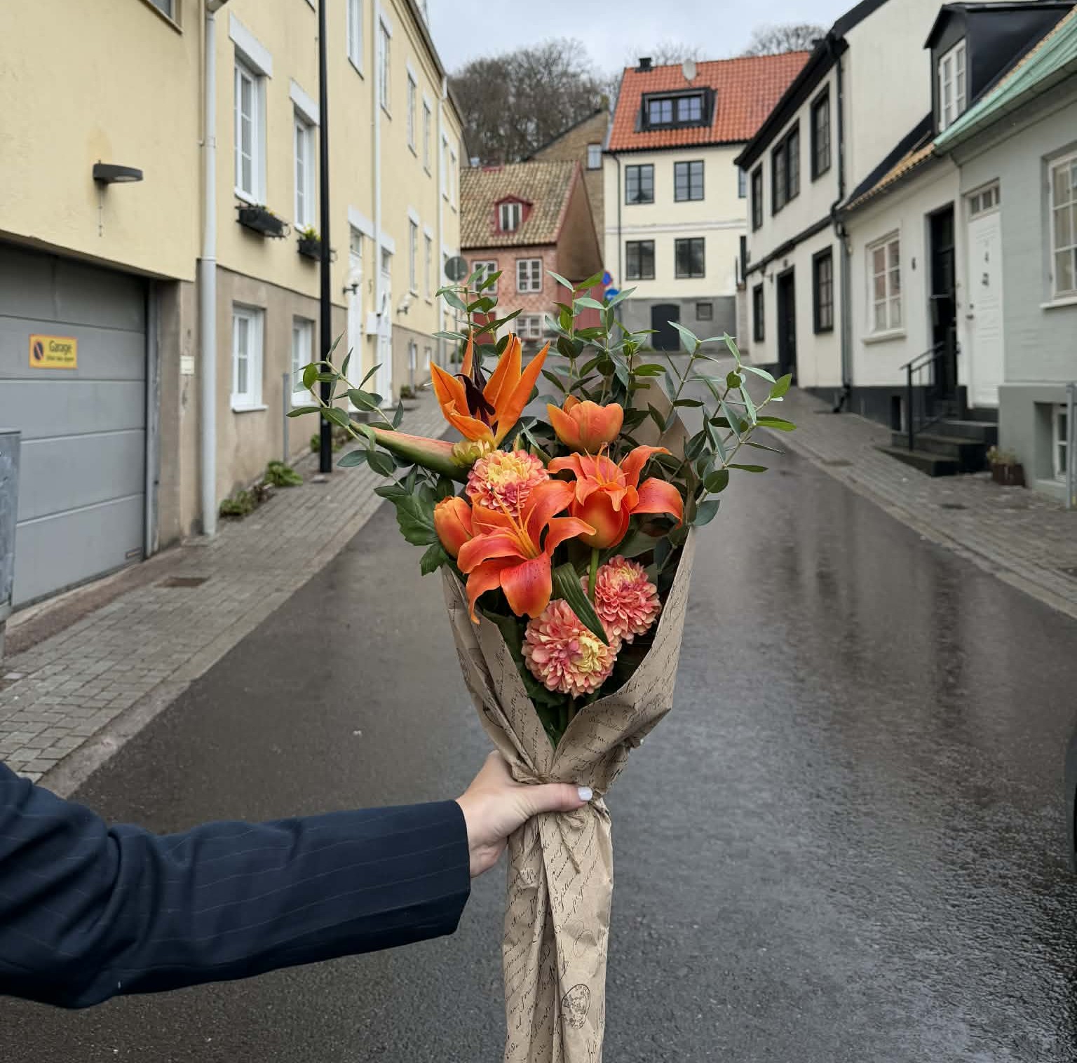 Den består av dekorativa orange liljeliknande blommor tillsammans med mindre blomdetaljer och gröna blad, vilket skapar ett fylligt och naturtroget arrangemang. Buketten är omsorgsfullt bunden och inslagen i brunt, rustikt papper med ett matchande band, vilket ger ett stilrent och elegant uttryck med en lätt lantlig känsla.