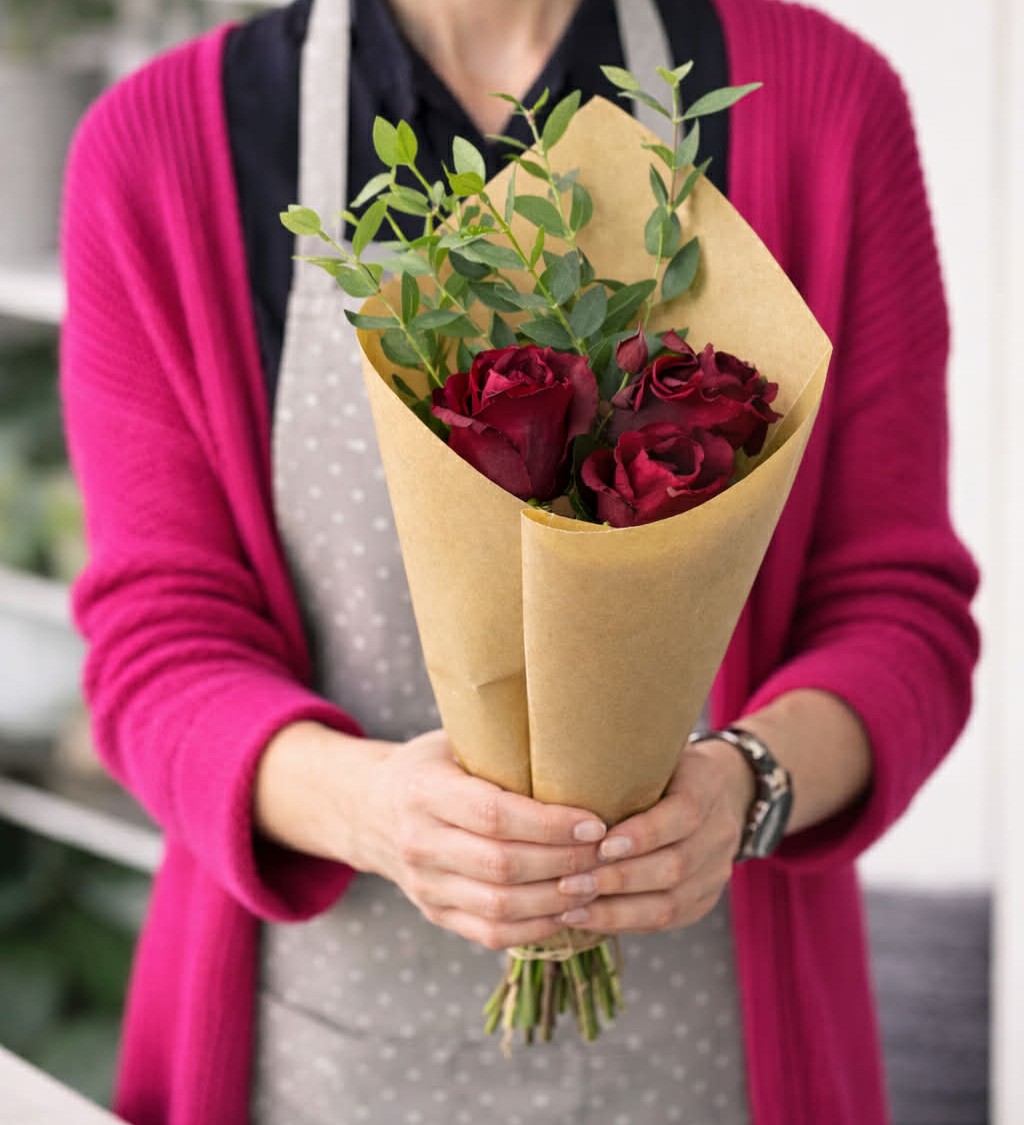 En elegant och stilren bukett med mörkt vinröda rosor i 35 cm längd, vackert kombinerade med en dekorativ eukalyptuskvist. Den djupa bordeauxfärgen på rosorna ger ett exklusivt och romantiskt uttryck, medan eukalyptusen tillför höjd, fräschör och en naturlig, mjuk kontrast. Buketten är omsorgsfullt inslagen i naturfärgat kraftpapper som förstärker den moderna, minimalistiska känslan. Den kompakta storleken gör den perfekt som en stilfull gest – genomtänkt, smakfull och full av karaktär. Passar utmärkt som: • Gå-bort-present • Middagsblomma • Romantisk överraskning • En elegant vardagslyx En liten bukett med starkt uttryck – där kvalitet, färg och form samspelar i en harmonisk helhet.