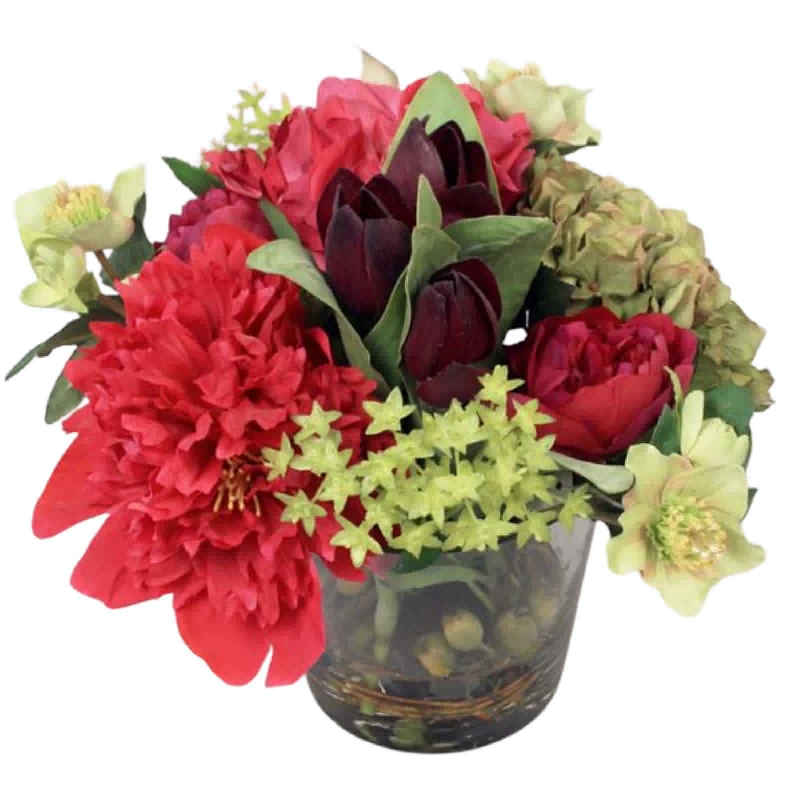 Konstgjord pion och tulpanbukett i glasvas. Buketten är en vibrerande explosion av färger och texturer, där varje konstgjord blomma bidrar till en harmonisk helhet. I centrum står de djupt röda pionerna, vars frodiga kronblad vecklas ut i en dramatisk symfoni av nyanser. Tillsammans med de mörklila tulpanerna skapar de en djärv kontrast som fångar ögat. De ljusgröna blommorna, med sina stjärnformade blommor, tillför en friskhet och en lätthet som balanserar de mörkare tonerna. De krämfärgade hortensiorna med gröna toner ger en subtil elegans och kompletterar arrangemangets övergripande palett. Allt detta är omsorgsfullt arrangerat i en klar glasvas, där de konstgjorda stjälkarna är diskret dolda, vilket ger en illusion av naturlighet och enkelhet. Arrangemanget är perfekt för att lägga till en touch av evig skönhet till vilket rum som helst, utan att behöva oroa sig för underhåll. Det är en tidlös dekoration som förkroppsligar både tradition och modernitet. Passar perfekt som bordsdekoration på restaurang, café eller hotell, där man vill skapa en inbjudande och elegant atmosfär utan behov av skötsel. Även idealisk för receptioner, loungeytor och privata miljöer. • Höjd: ca 45 cm • Färg: Röd / grön • Material: Konstgjorda snittblommor, glasvas, konstgjort vatten • Underhållsfri – alltid fräsch och representativ En stilren och hållbar dekoration som lyfter dukningen och skapar en varm, exklusiv känsla i restaurangmiljöer och på bord.