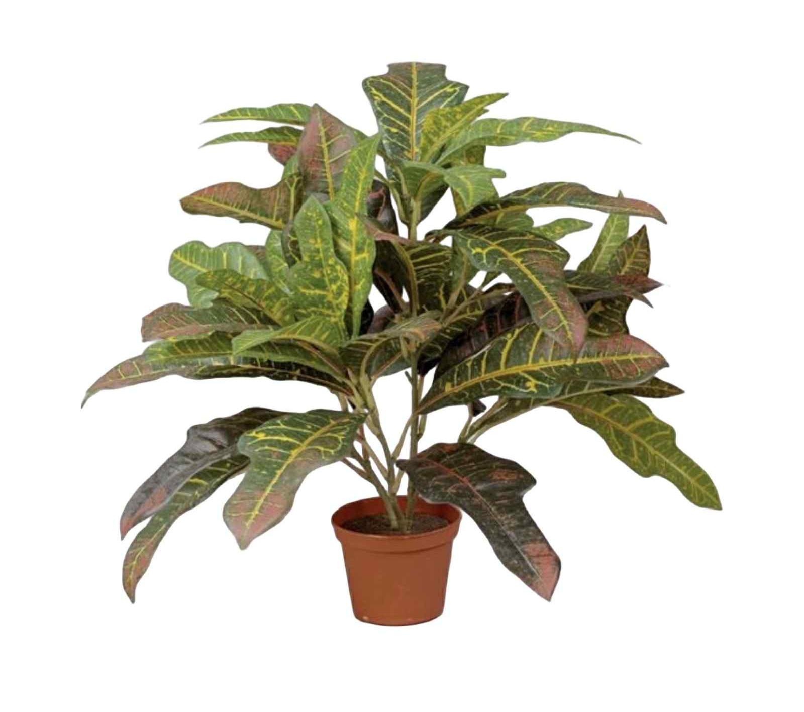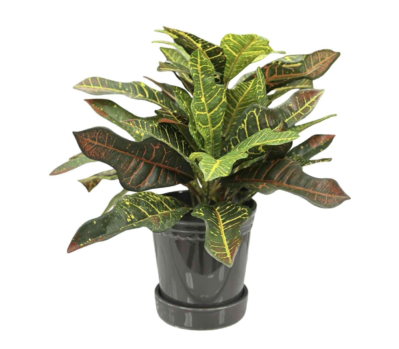 Denna konstgjorda kroton utmärker sig med sina kraftfulla, dekorativa blad i djupa gröna toner, levande gula nerver och varma inslag av rött och orange. Bladens varierande färgspel och naturtrogna struktur ger ett exklusivt och livfullt intryck som påminner starkt om en äkta växt. Växten har en tät och fyllig form som skapar volym och fungerar utmärkt som accent i både privata och offentliga miljöer. Med en höjd på 32 cm är den perfekt för hyllor, bord, receptionsdiskar och fönsterbänkar. Levereras i en stilren, mörk kruka som gör den lätt att placera direkt i interiören eller att sätta i ytterkruka efter behov. Perfekt för kontor, restauranger, hotell, butiker och hem där man vill ha ett grönt inslag utan krav på skötsel, ljus eller vattning.