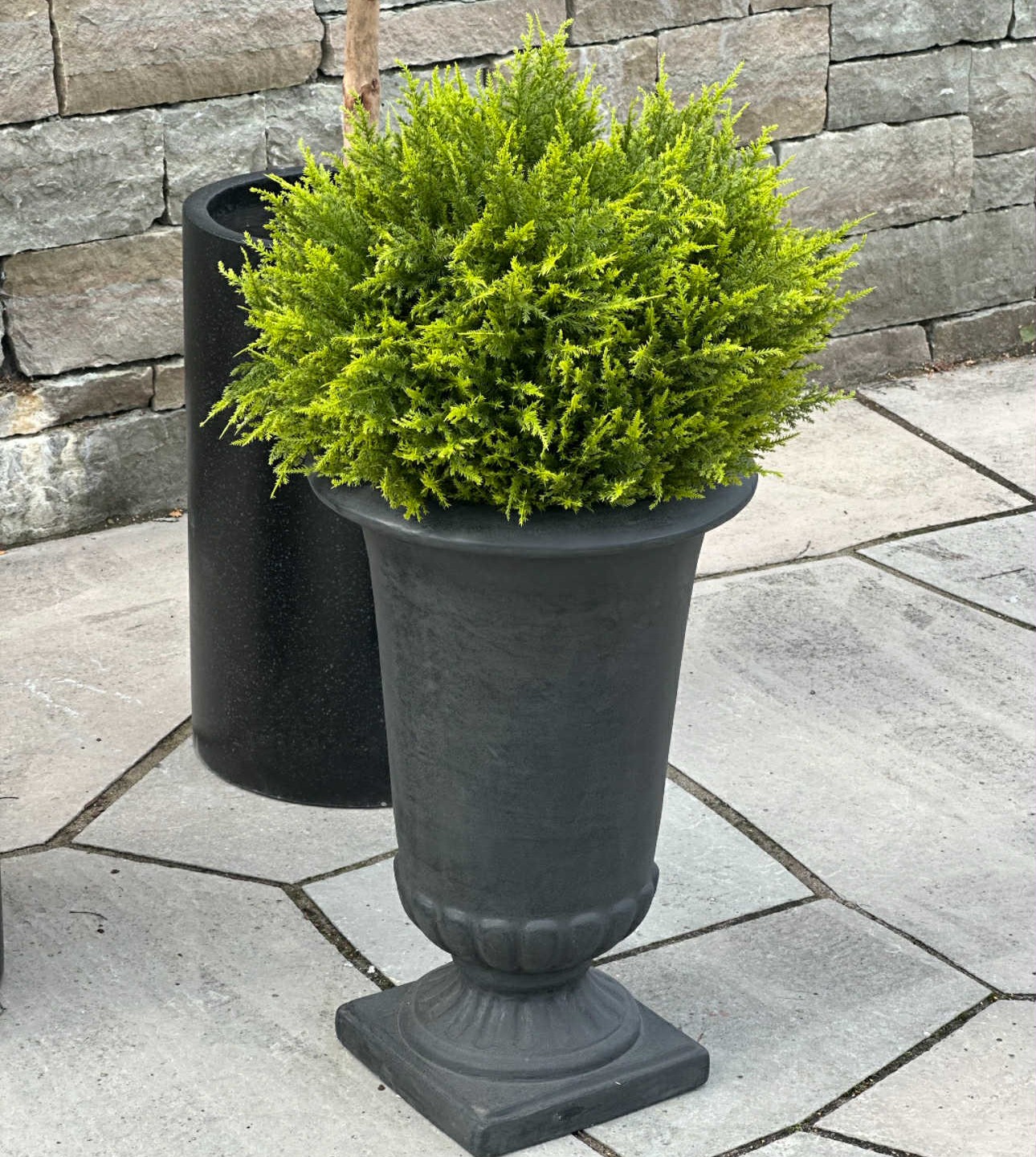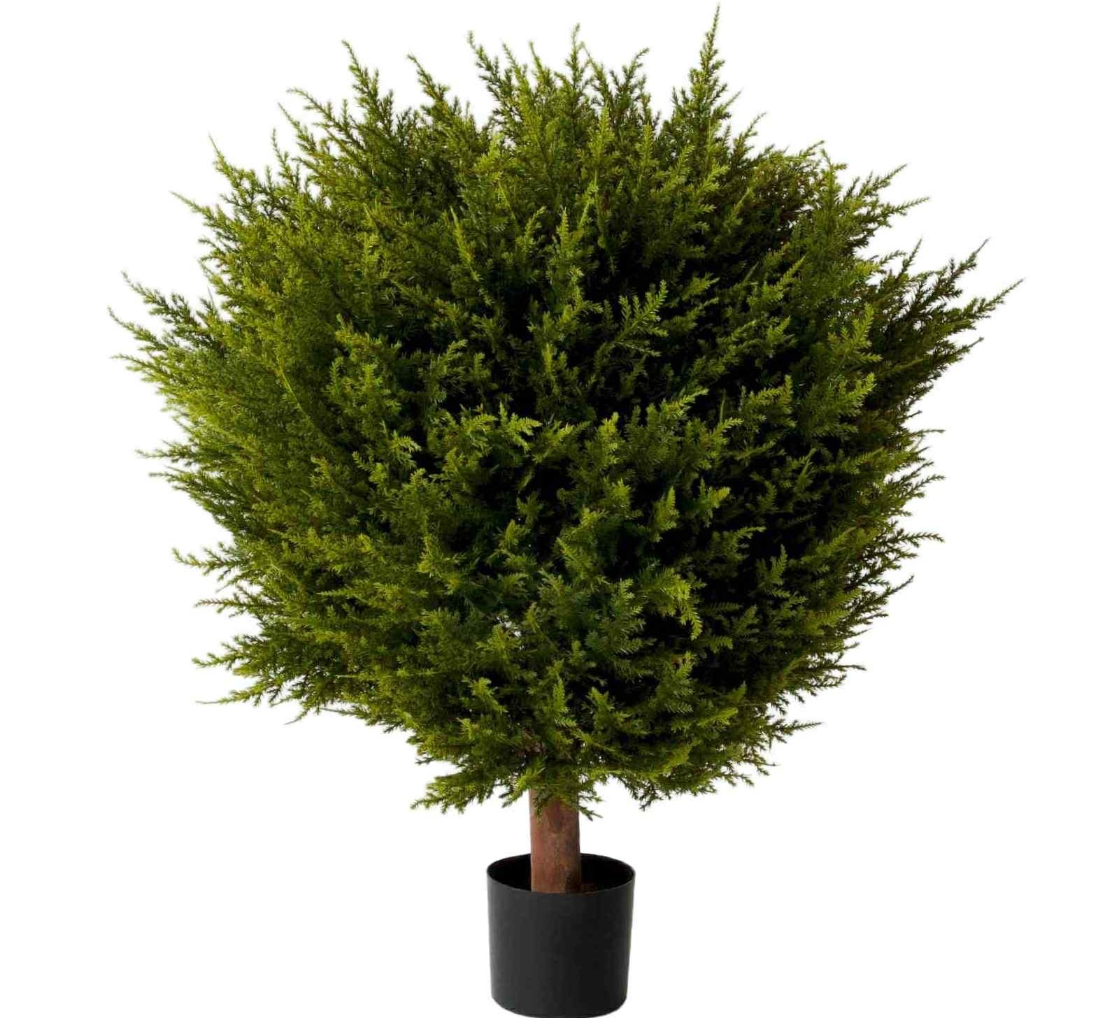 En enormt naturtrogen och vacker grön STOR boll formad cypressbuske. En tätt buskage av mycket hög kvalitet. Snygg utanför din entré, terras. Våra träd har riktig trädstam. Bladen som är tillverkade i tyg är UV-beständiga. Detta innebär att bladen kan stå emot solens UV-strålning under en längre tid och därmed håller färgen bättre än andra produkter. Dom tål även vatten. Plasten, som används bland annat till grenar är återvunnen LDPE-plast. Perfekt utomhusväxt.