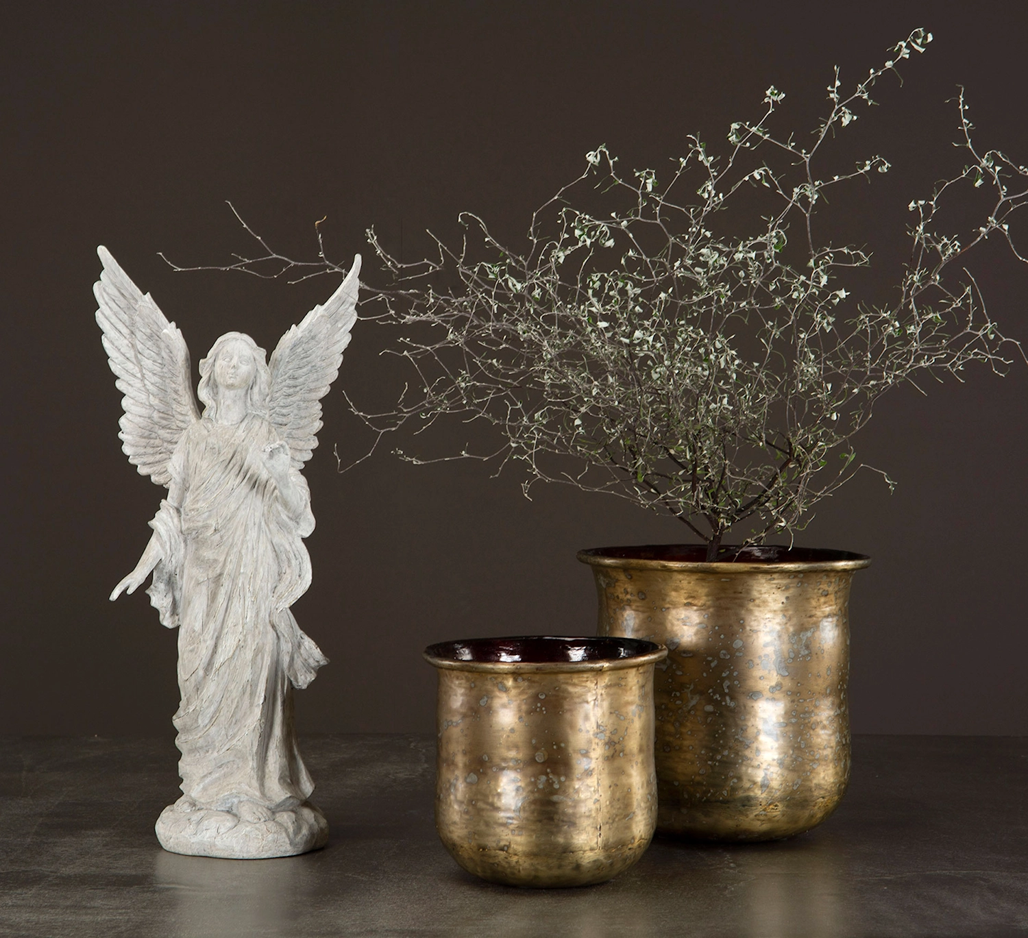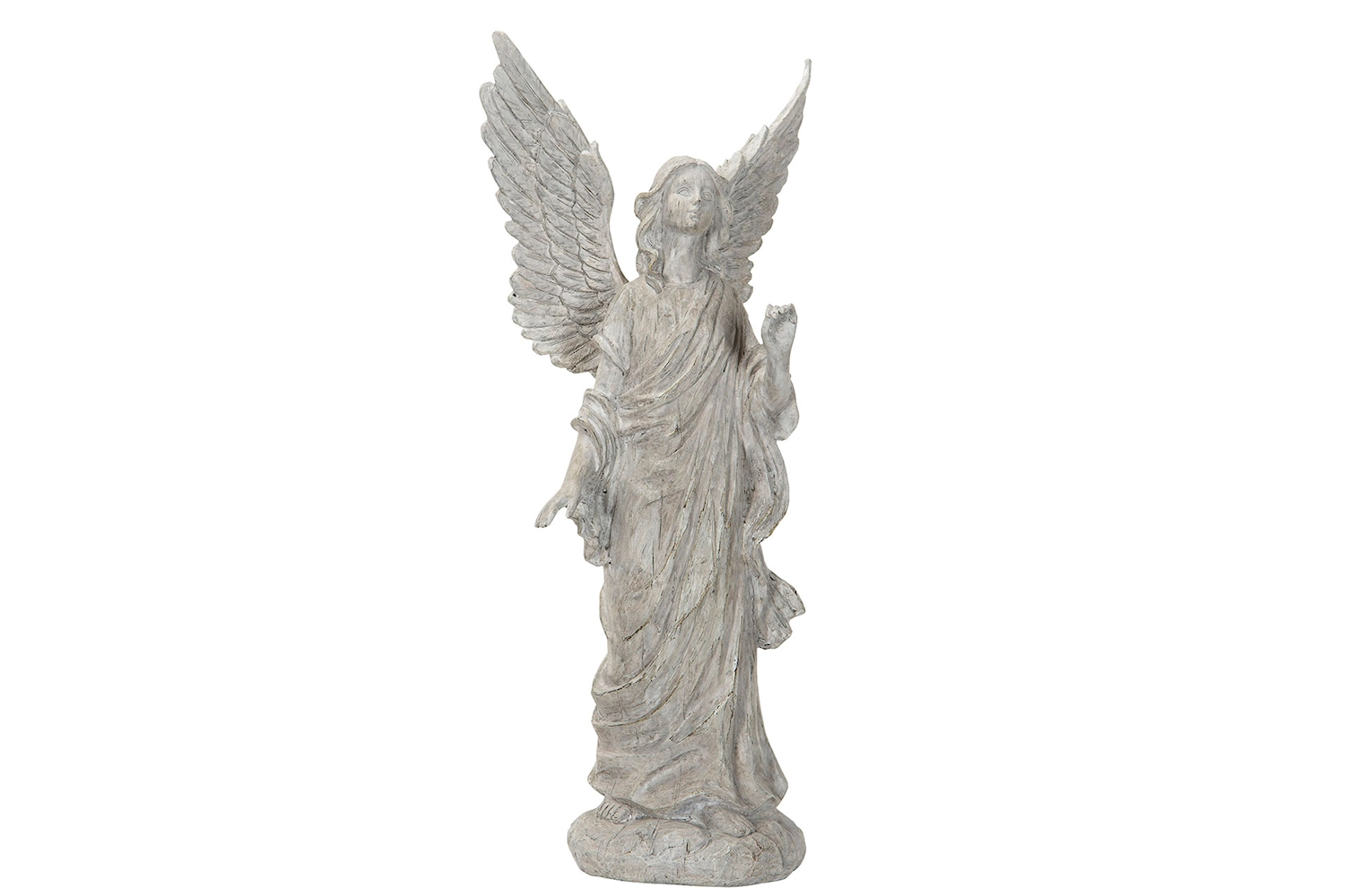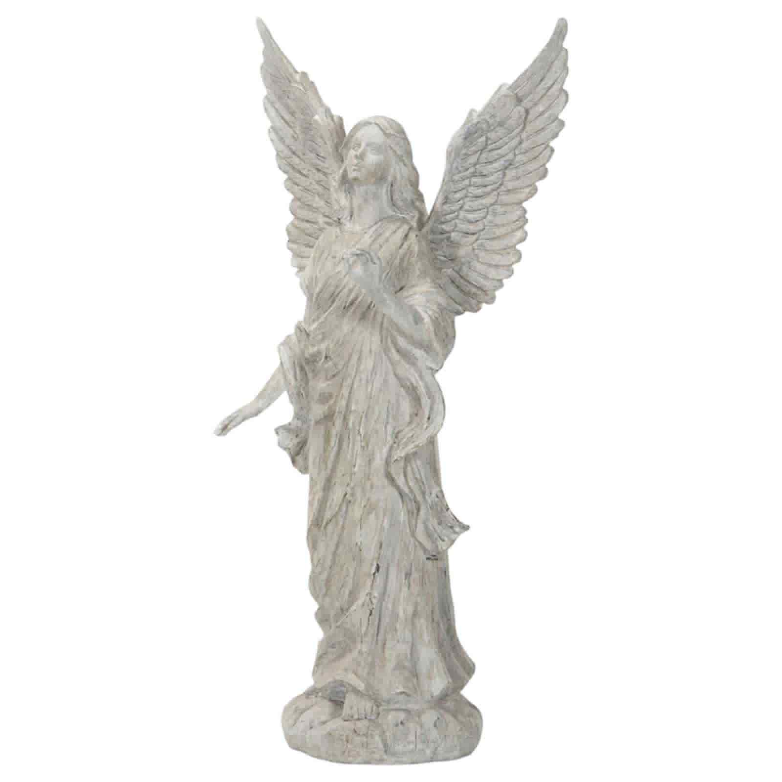 Fridfull ängel, utförd i en ljus, stenliknande design. Ängeln är avbildad i en stående position, med sina majestätiska vingar utsträckta bakom sig. Den bär en lång, svepande klädnad som faller mjukt ner mot basen. Ansiktet har ett fridfullt och lugnt uttryck, vilket förstärker den himmelska känslan. Ängeln håller i ena handen ett draperat tygstycke, vilket ger en känsla av rörelse och liv åt skulpturen. Den står stadigt på en rund bas, vilket ger hela verket en balanserad och harmonisk framtoning. Detaljrikedomen i utformningen, från de eleganta vingarna till den flödande dräkten, bidrar till en känsla av ro och andlighet.. Material: Poly. Mått: 18x15x41cm