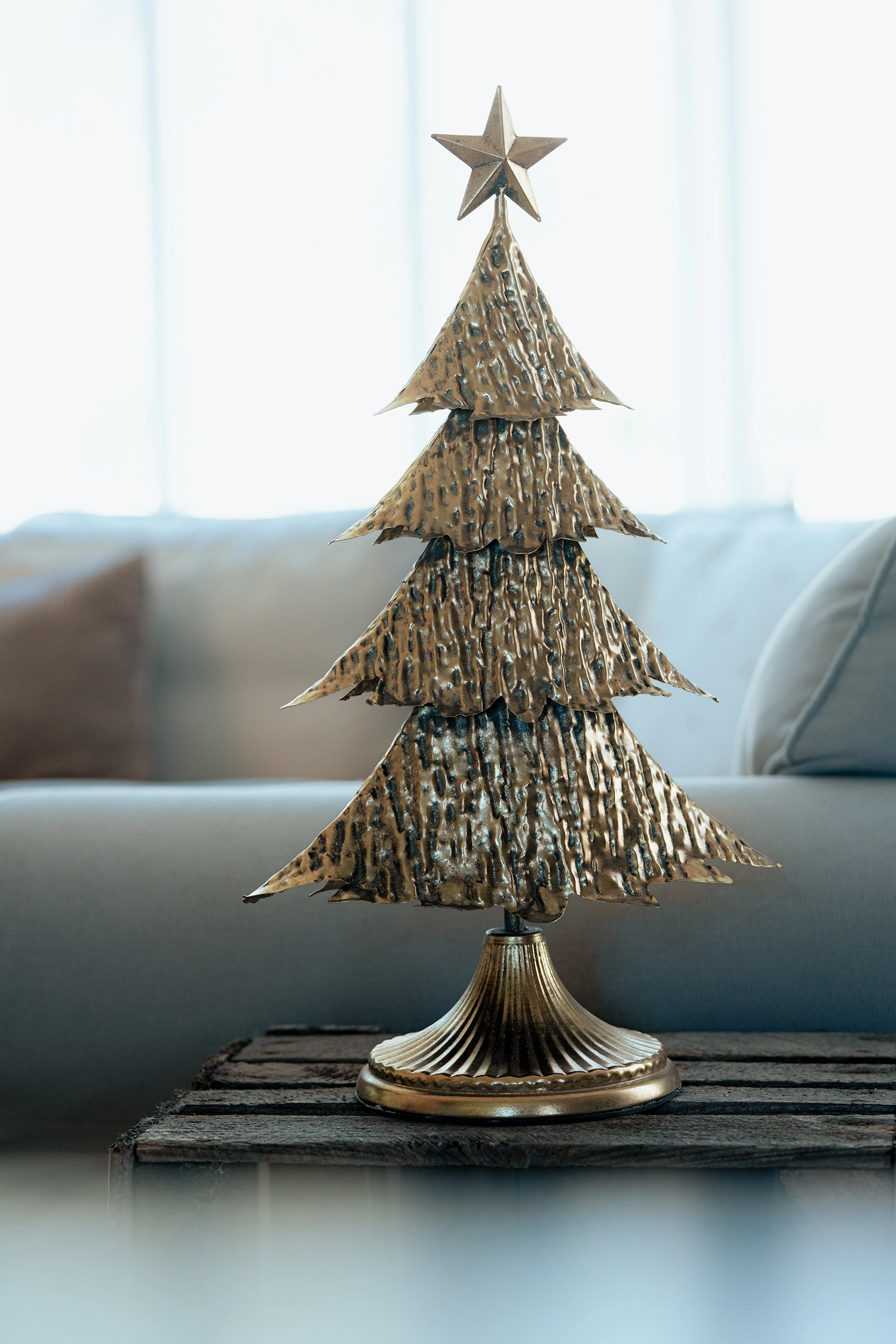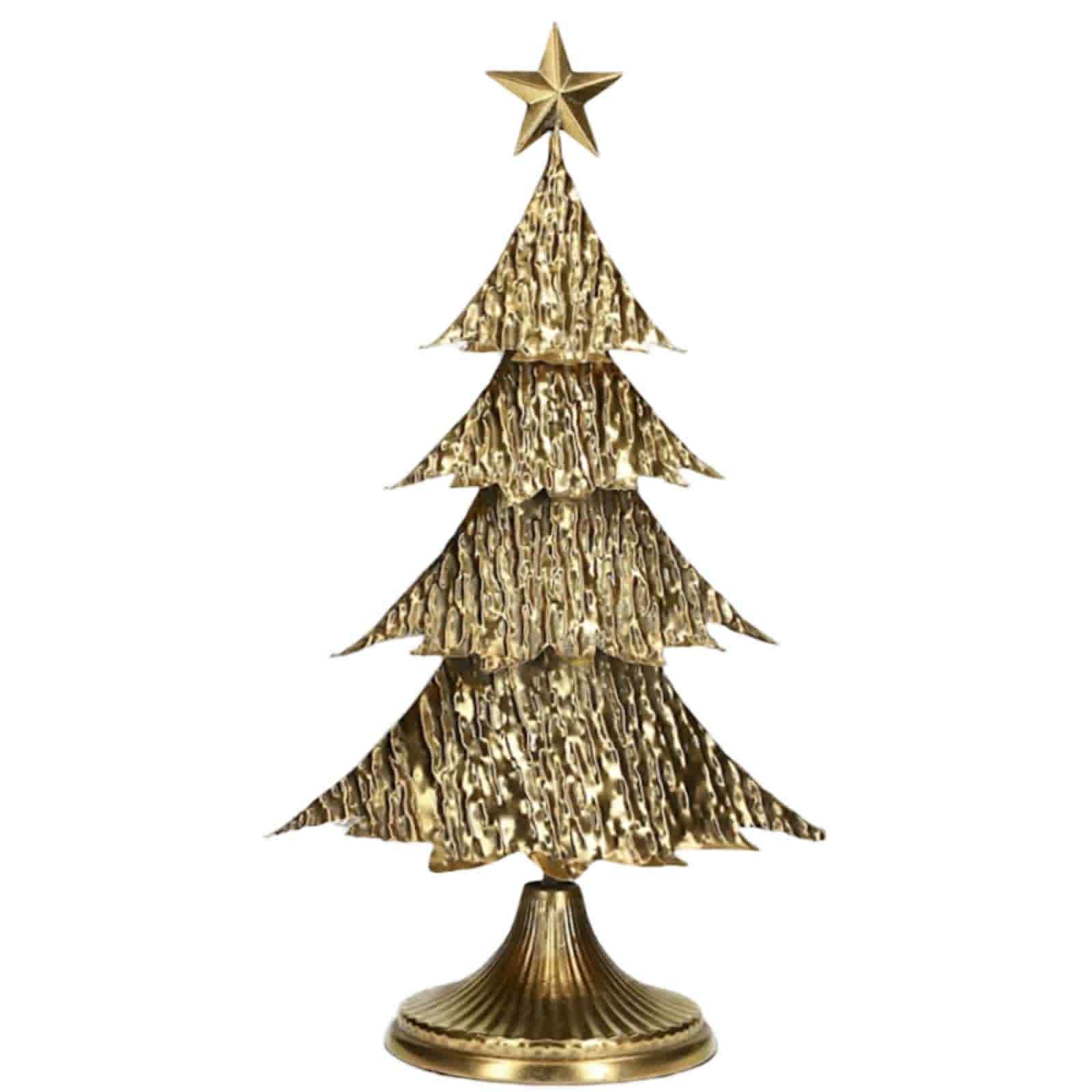 Guldig julgran i metall. Granen har en stiliserad design med flera skiktade lager som bildar grenarna. Varje lager har en vågig, strukturerad yta som ger ett elegant utseende. Granen står på en fot och är toppad med en stjärna, vilket är typiskt för julgransdekorationer. Hela objektet har en guldfärgad metallfinish, vilket ger det en glansig och festlig känsla..Storlek:30x18x54cm Material: Metall