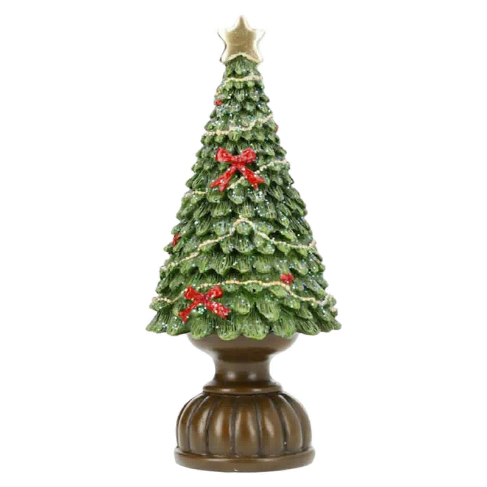 Dekorativ julgran. Granen är utsmyckad med röda rosetter, julkulor och glittergirlanger som ger den en festlig känsla, och på toppen sitter en stjärna som kröner verket. Hela arrangemanget vilar på en brun bas, vilket ger stabilitet och en elegant kontrast till det gröna och röda..Storlek:Ø10x24cm Material: Poly