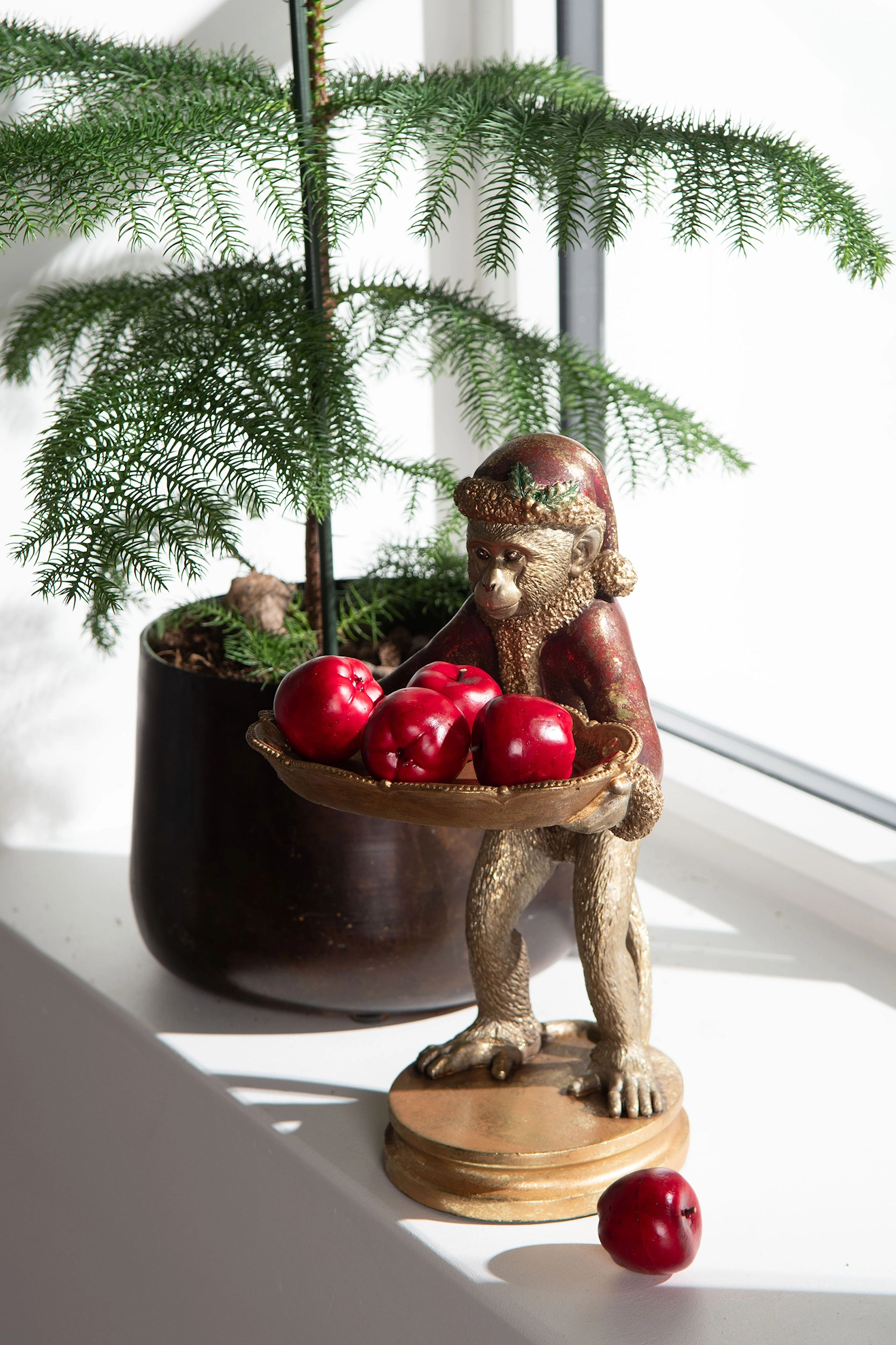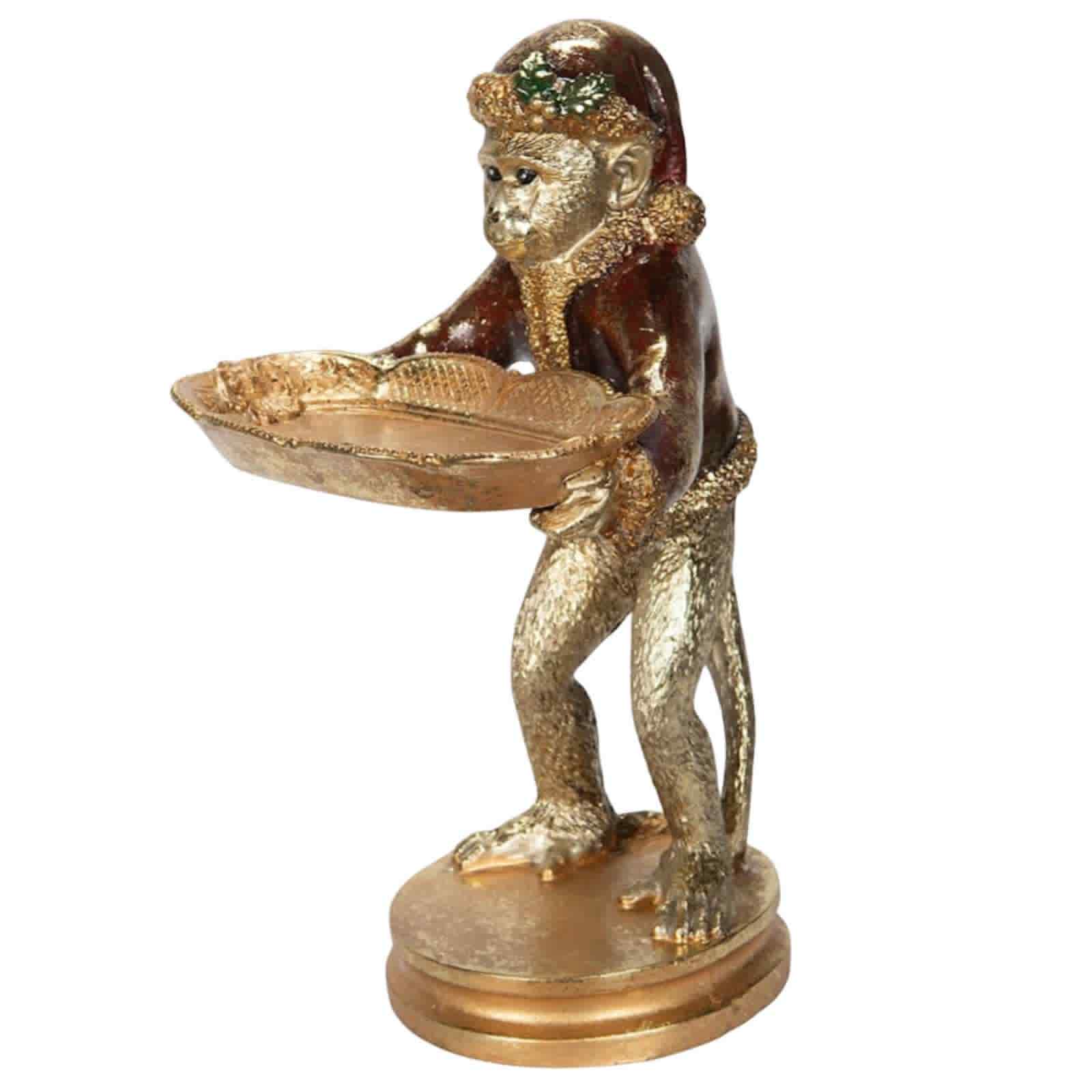 Julig apa med fat. Apan balanserar på en rund plattform och håller ett fat framför sig med båda händerna. Den bär en glänsande röd jacka som är prydd med guldfärgade detaljer, vilket ger en känsla av elegans och exklusivitet. På huvudet har apan en dekorerad tomteluva, vilket ytterligare förstärker dess festliga och pråliga framtoning. De gyllene tonerna och de noggrant utförda detaljerna skapar en lyxig och högtidlig atmosfär kring figuren.. Material: Poly. Mått: 16x17x27cm