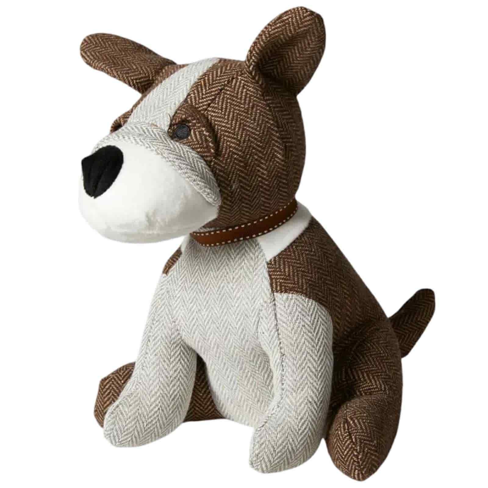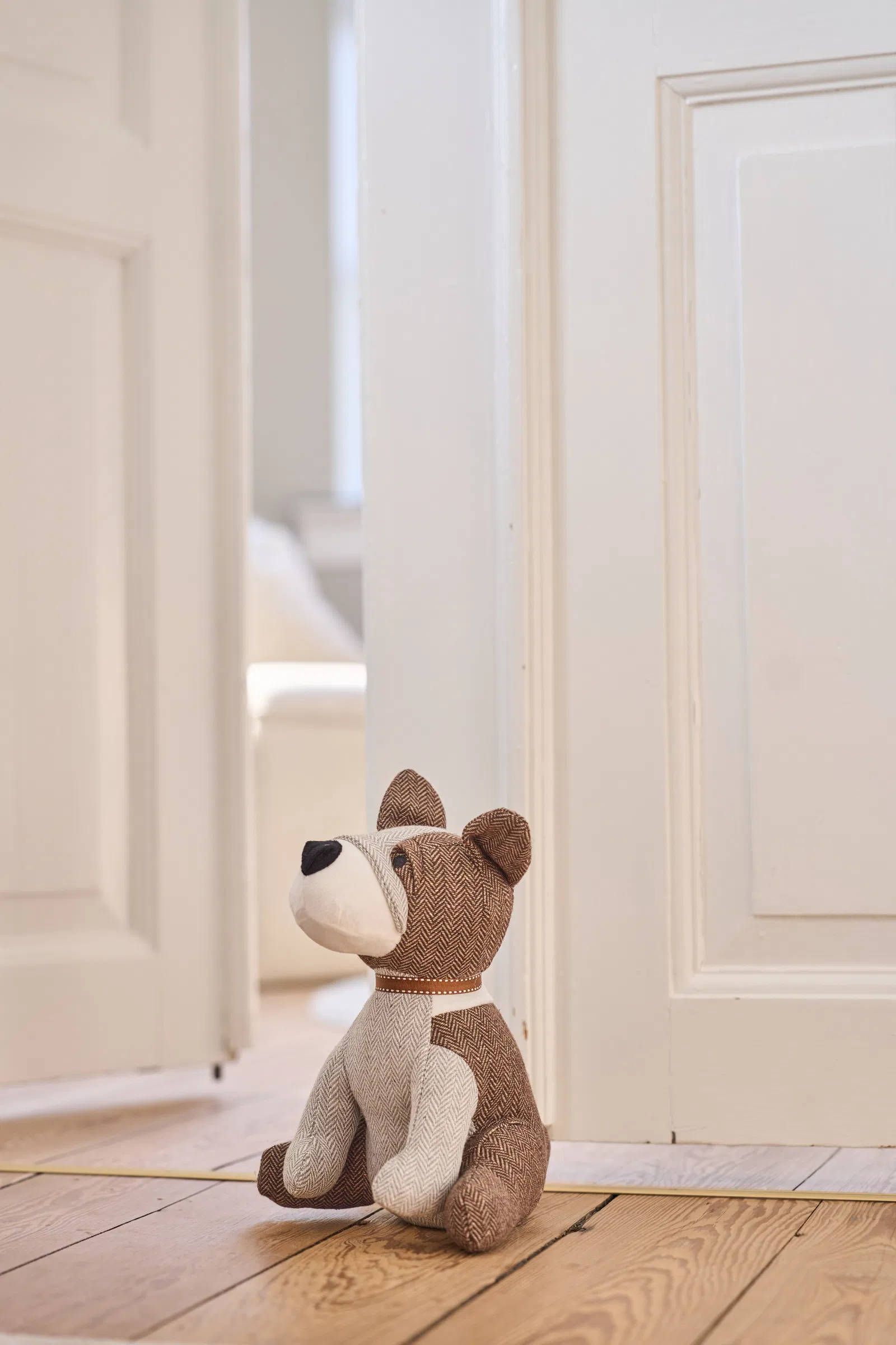 Cool och rolig dörrstopp. Denna charmiga dörrstopp är utformad som en söt liten hund, vars uttrycksfulla ansikte och detaljer ger en känsla av både elegans och lekfullhet. Hunden är tillverkad av ett tyg med ett klassiskt fiskbensmönster i jordnära bruna och grå nyanser, vilket ger den ett sofistikerat och tidlöst utseende. Tyget har en mjuk men robust känsla, vilket gör att hunden känns både pålitlig och stilfull. Det vävda fiskbensmönstret bidrar till en känsla av hantverk och tradition. Kombinationen av brunt och grått skapar en harmonisk balans som passar i de flesta inredningsstilar, från det klassiska till det moderna. Hunden har en sött avvägd nos och ögon som ger den ett vänligt och inbjudande utseende. Den lilla svarta nosen och de runda, glittrande ögonen ger en känsla av livfullhet. Ett diskret brunt halsband ger en extra touch av karaktär och stil, som om vår lilla vän precis kommit hem från en promenad i parken. Dörrstoppens tyngd är precis lagom för att hålla en dörr öppen utan att glida, vilket kombinerar funktionalitet med charmig design. Passar perfekt för hundälskare eller den som vill ha en lekfull men ändå elegant inredningsdetalj. Storlek: 23 cm. En mycket praktisk detalj i ditt hem! Nu behöver du inte längre bli Irriterad över dörrar som slår igen hårt vid korsdrag, med det här snygga dörrstoppet i tyg kan du förhindra det och samtidigt ha den som en snygg inredningsdetalj. Webflower har ett brett sortiment av allt från konstgjorda växter till inredning och roliga prylar.