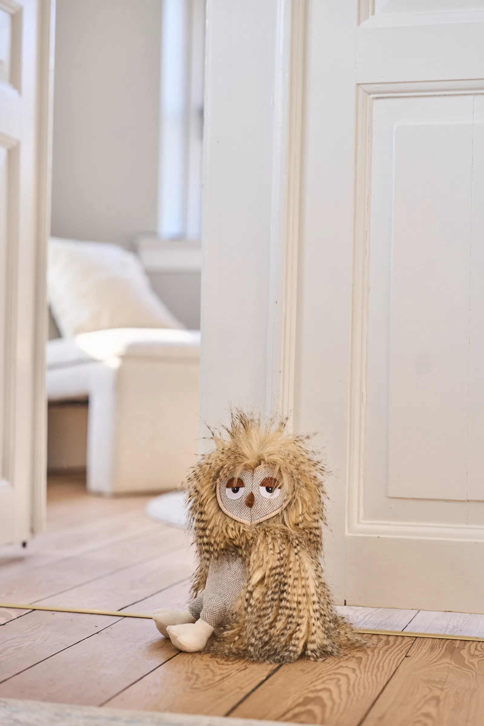 Cool och rolig dörrstopp som form av en uggla. Denna dörrstopp är formad som en charmig uggla, designad för att bringa både funktion och stil till ditt hem. Med ett utseende som fångar essensen av en gammal, vis skogsvarelse, kombinerar den olika texturer och färger för att skapa en inbjudande och vänlig atmosfär. Ugglan har ett rikt, fluffigt yttre med en mjuk, pälsliknande struktur som ger den ett mysigt och inbjudande utseende. Den bruna och beige färgpaletten förstärker dess naturliga och jordnära känsla, och små detaljer som de bruna fläckarna ger den en autentisk touch. Ansiktet är uttrycksfullt och konstnärligt utformat med halvslutna ögon som ger den en trött men klok blick. Näbben är liten och centralt placerad, vilket ger ett balanserat uttryck.  Vingarna är subtilt markerade, och fötterna är enkla men funktionella, vilket förstärker ugglans stabilitet som dörrstopp.  En kombination av mjuka tyger och robusta material gör ugglan både hållbar och behaglig att röra vid. Den är tung nog för att hålla en dörr på plats, men samtidigt tillräckligt mjuk för att hanteras enkelt. Denna uggla är mer än bara en dörrstopp; den är en dekorativ detalj som kan ge liv åt vilket rum som helst. Med sin charmiga närvaro och praktiska funktion är den en perfekt blandning av stil och nytta. Nu behöver du inte längre bli Irriterad över dörrar som slår igen hårt vid korsdrag, med det här mysiga ugglan kan du förhindra det och samtidigt ha den som en snygg inredningsdetalj. Webflower har ett brett sortiment av allt från konstgjorda växter till inredning och roliga prylar. Mått: Höjd: 24 cm. Vikt: ca. 1 kg Tillverkad av polyester. #dörrstopp