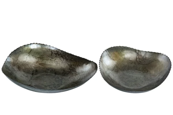 Ytan är texturerad och något krackelerad, med en metallisk eller stenliknande finish. Färgerna är dämpade med nyanser av grått, svart och grönt. Kanterna är ojämna eller “taggiga”, vilket ger föremålet en naturlig eller åldrad känsla. Formen är asymmetrisk och ger ett intryck av rörelse eller balans. Säljes i set om två.Storlek:31x26x7cm & 29x24x6cm. Material: Metall.