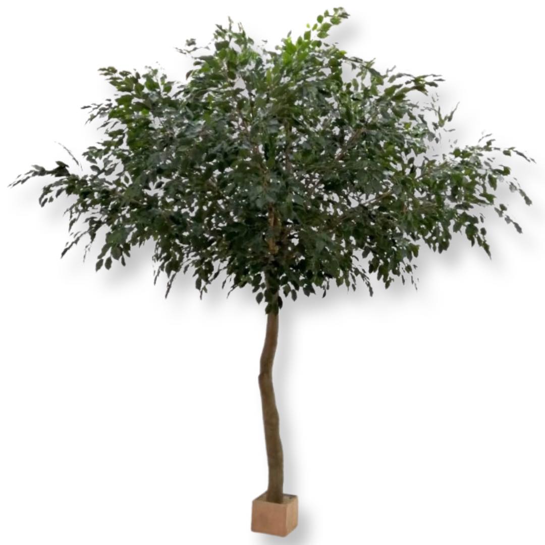Ett av våra mest lyxiga och högklassiga samt största konstgjorda träd i glasfiber. Ett mycket välgjort fikus Benjamin-träd. Ett mycket bladigt träd. Detta paraplyfikus har glasfiberstam. Grenverket i kronan är tillverkad av äkta naturträ. Trädet kommer med separat stam och grenar som är enkelt att montera ihop. Varje grenverk är numrerad och kan enkelt placeras i matchande hål med samma numrering i stammen. Trädet är lätt att montera upp och montera ner om det skulle behövas. Bladen på grenverket är tillverkade i tyg är UV-beständiga. Detta innebär att bladen kan stå emot solens UV-strålning under en längre tid och därmed håller färgen bättre än andra produkter. De tål även vatten. Plasten, som används bland annat till grenar, är återvunnen LDPE-plast. Kronan är ca 350 cm i diameter. Total höjd 400 cm. Trädet är monterad och står i en träbox/sockel 33x33x33x