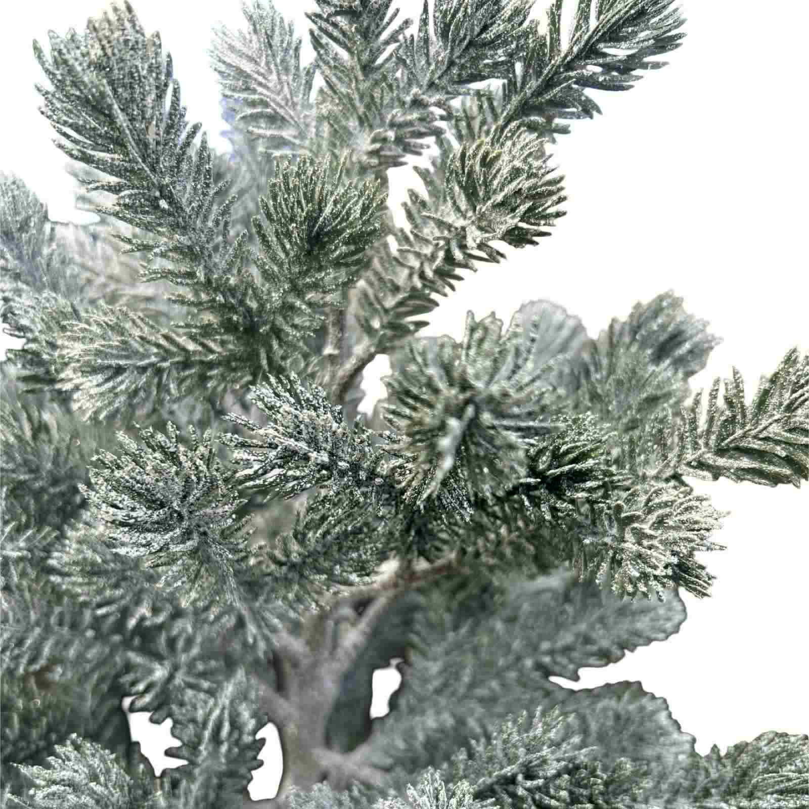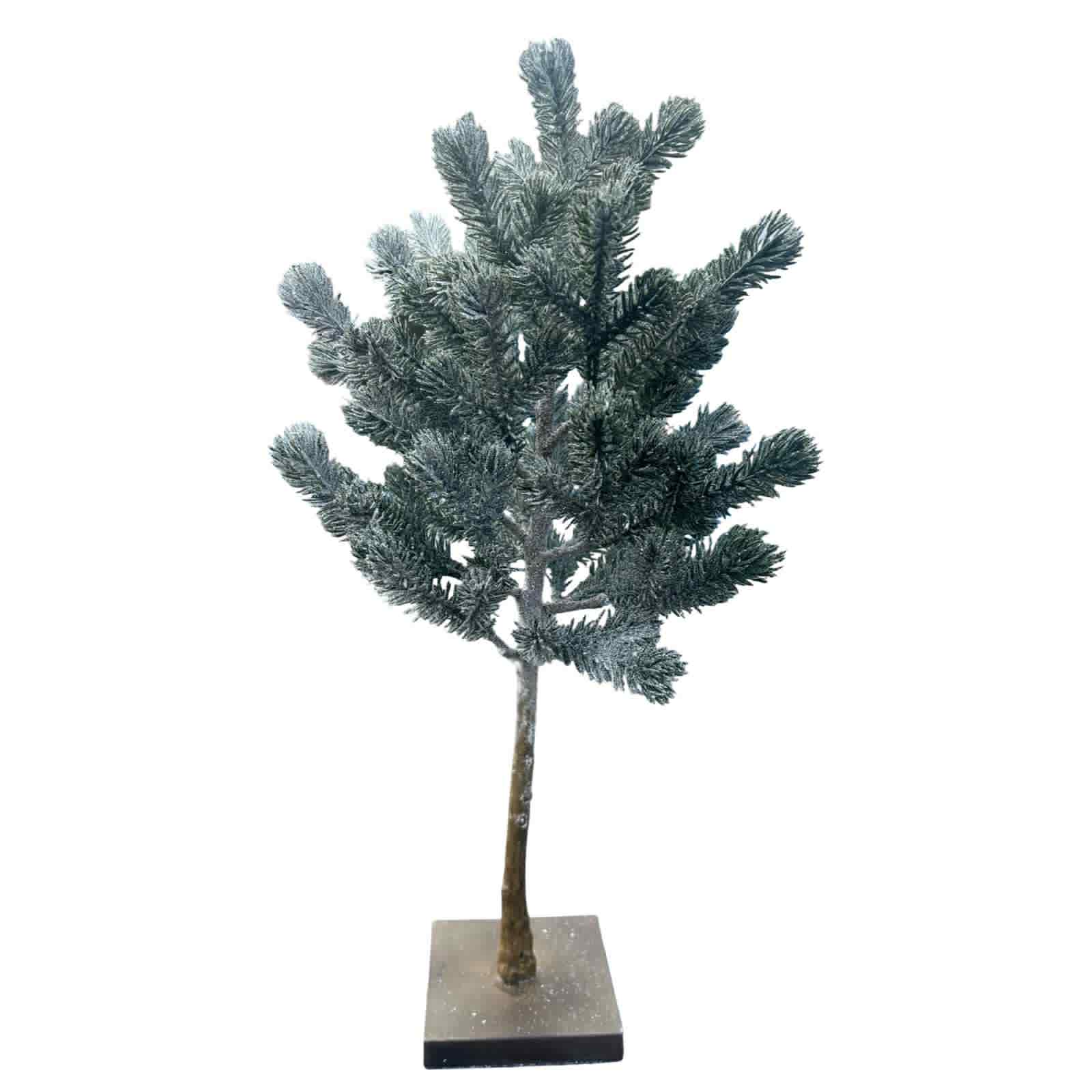 Dekorativ konstgjord gran. Det står stadigt på en fyrkantig bas som ger stöd åt trädet. Grenarna är täckta med ett lager konstsnö, vilket skapar en illusion av ett vinterlandskap. Dessa barrliknande grenar är tätt placerade längs en brun stam, vilket ger trädet ett fylligt och frodigt utseende. Trädet är designat för att efterlikna ett vintergrönt träd, med en jämn fördelning av grenar som bidrar till dess symmetriska och estetiskt tilltalande form. Storlek: 45 cm