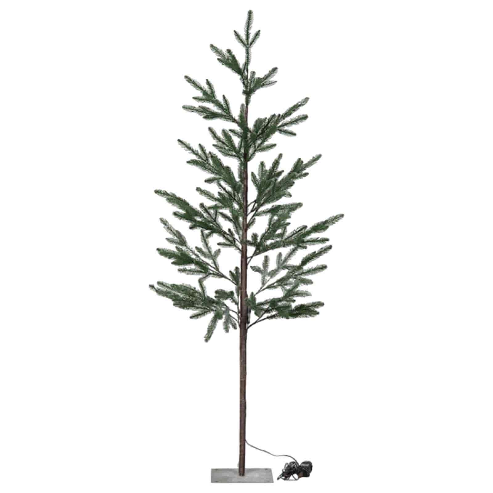 Modern julgran med smal och minimalistisk design för utomhusbruk. Granens grenar är tunna och sparsamt placerade, vilket ger den ett luftigt och stilrent utseende. Den står på en enkel bas och har en integrerad LED-belysning med 240st varmt lysande lampor för ett stämningsfullt ljus. Granen är dekorerad med frostiga inslag, vilket ger den ett vintrigt utseende.