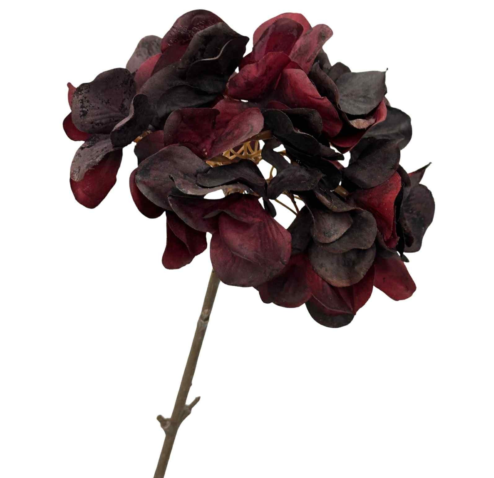 Konstgjord hortensia i färgen bordeau har en djup, rik röd nyans som påminner om vinrött. Blommorna är tätt packade och ger ett fylligt intryck. Stjälken är lång och smal och utan blad, vilket gör den lätt att placera i olika arrangemang. Den övergripande designen är elegant och tidlös, perfekt för att ge ett sofistikerat inslag till vilken inredning som helst. Storlek: 50 cm