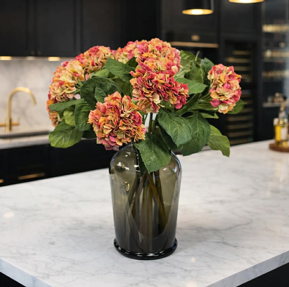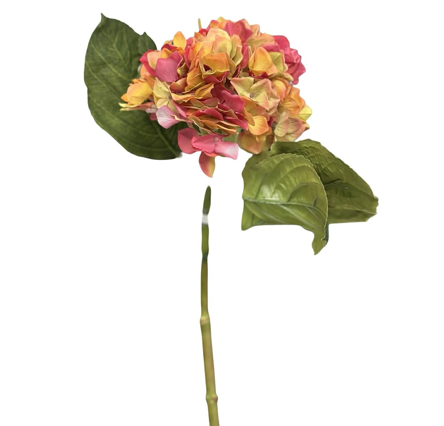 Exklusive och Högklassig, välgjord Hortensia snittblomma i rosa, orange och gul. Snygg ensam i vas på bordet eller mixad i stor bukett i större vas. Snygg på terrassen under sommarmånaderna. Funkar utmärkt att klippas av med avbitartång för att passa in med andra snittblommor Webflower har Hortensior i olika storlekar och färger. Hortensian är en omtyckt blomma. Hortensia var från första början en trädgårdsväxt men ses idag både som krukväxt & snittblomma. Denna snittblomma är 80 cm.  Bladen och blommorna är tillverkade i tyg. Bladen är UV-beständiga. Detta innebär att bladen kan stå emot solens UV-strålning under en längre tid och därmed håller färgen bättre än andra produkter. De tål även vatten.