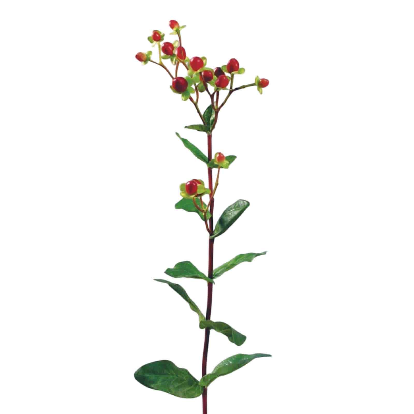 Hypericum, även känd som johannesört. Den har flera röda bär som sitter på tunna stjälkar, och några gröna blad spridda längs med stjälken. Bären är små och runda, och bladen är ovala och ganska glänsande.