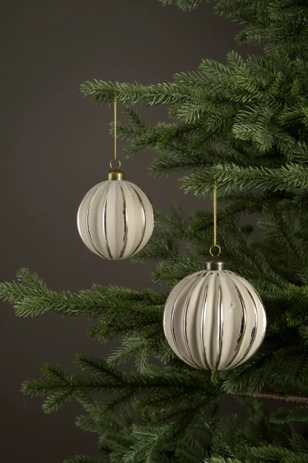 Inspireras av året vackra och exklusiva glas julkulor i vitt med silverdetalj. Har en diameter på Ø10cm. Snyggt granen, i skålen eller i kransen. Kommer i två olika former. Ligger 2 st per förpackning. Eller köp 12 pack
