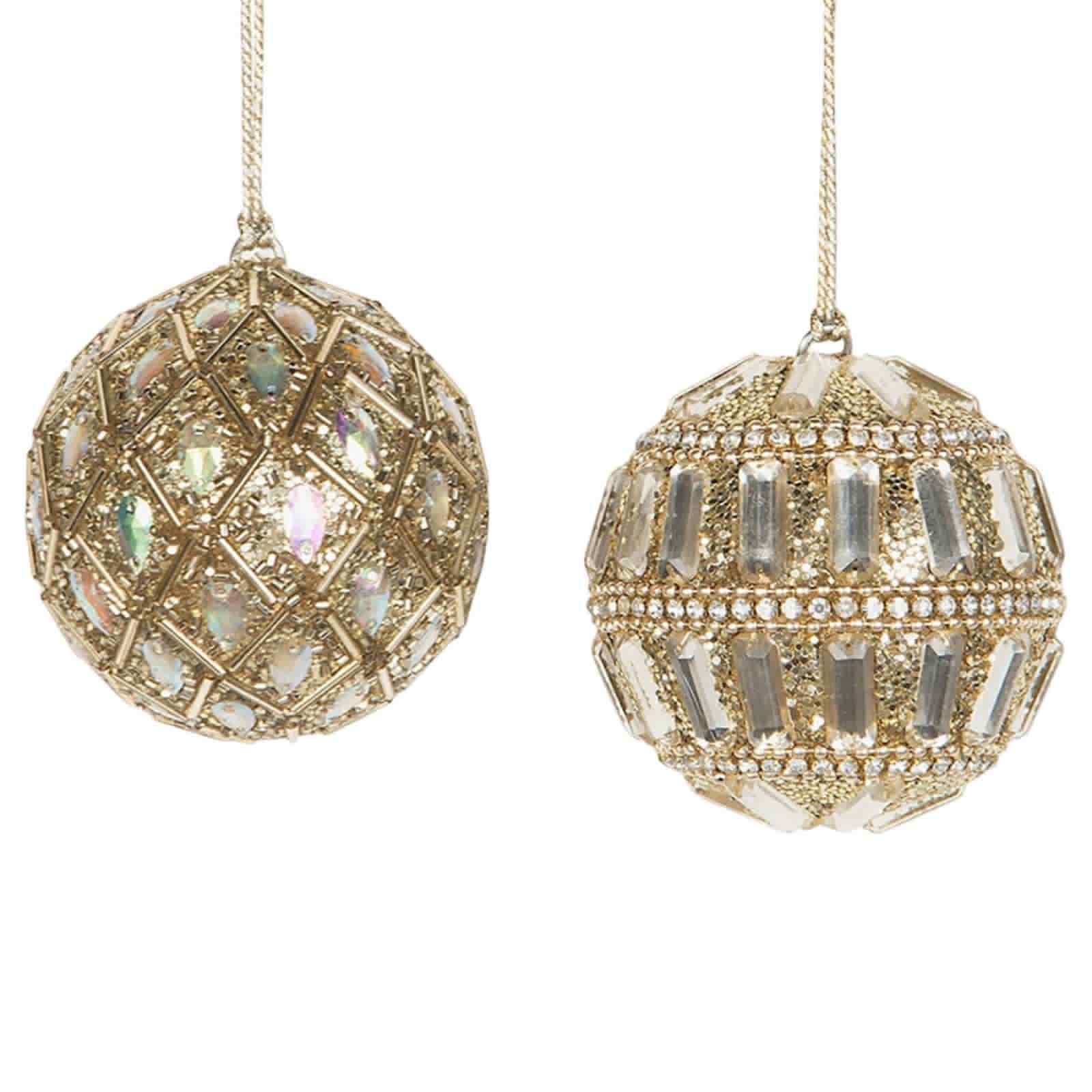 Gnistrande julgranskulor. Båda kulorna är täckta med glittrande detaljer och har en lyxig känsla. Den vänstra kulan har ett rutliknande mönster av gyllene linjer. – Inuti varje rutsektion finns skimrande, prismor som reflekterar ljus i olika färger. Den högra kulan har ett mönster med vertikala gyllene linjer och glittrande pärlor och strass. – Mellan de gyllene linjerna finns rektangulära, stenar i strass. Båda kulorna hänger i gyllene snören och utstrålar en festlig och elegant atmosfär.