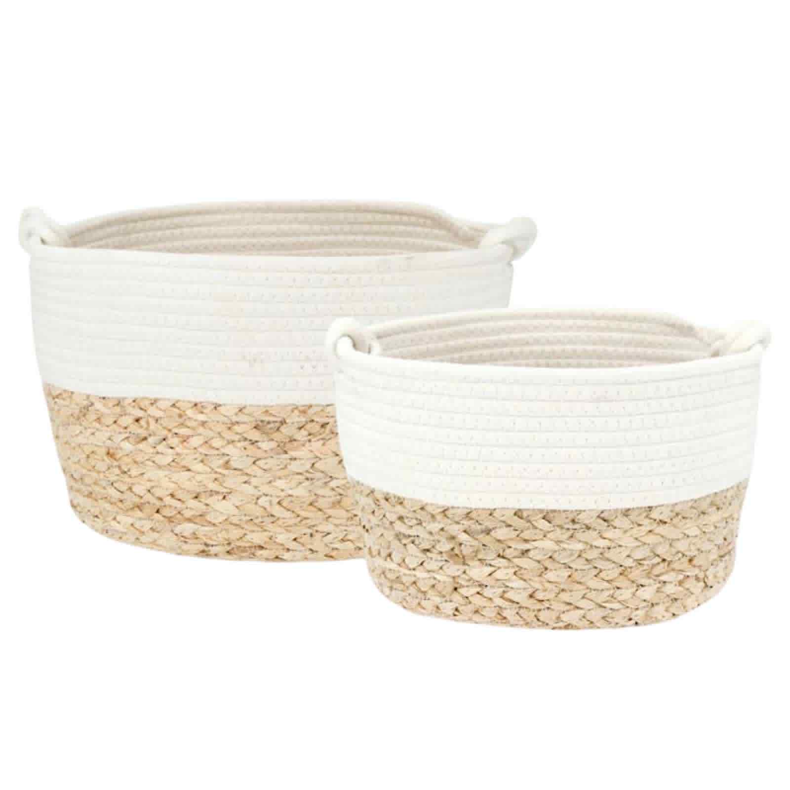 2 set flätade korgar. De två flätade korgarna du ser är en vacker kombination av funktion och estetik, skapade av naturliga material som ger en känsla av jordnära elegans. Den nedre delen av korgarna är gjord av ett naturskönt, flätat material. Detta ger dem en robust och hållbar struktur. Den flätade designen skapar ett mönster som både är visuellt tilltalande och praktiskt, genom att ge stabilitet och ventilation. Den övre delen av korgarna är flätat med ett slätt, ljust tyg. Denna del ger en mjuk kontrast till den flätade basen och förstärker den övergripande designens subtila elegans. Korgarna har en rund form med mjuka kanter, vilket gör dem idealiska för förvaring av olika föremål. Varje korg har integrerade handtag, vilket gör dem lätta att flytta runt. Handtagen är diskret integrerade i designen och förstärker korgarnas praktiska användbarhet utan att kompromissa med deras estetik. Kombinationen av den naturliga, jordnära tonen i flätmaterialet och den rena, vita övre sektionen ger dessa korgar ett harmoniskt och balanserat utseende som passar in i de flesta heminredningar. Texturkontrasten mellan det flätade materialet och den släta textilen skapar en visuellt intressant yta. Dessa korgar erbjuder en perfekt balans mellan stil och funktionalitet. De kan enkelt integreras i olika inredningsstilar, från bohemisk till minimalistisk. Deras naturliga materialval och genomtänkta design gör dem till ett hållbart och stilrent val för moderna hem.  Storlek:Ø31×20 cm Ø27×16 cm