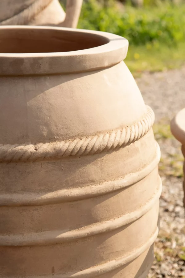 Det här är en terrakotta-kruka med en diameter på 45 cm, en bredd på 27 cm och en höjd på 57 cm. Den är cylindrisk i formen och har en naturlig, jordnära färg som är typisk för terrakotta. På ytan av krukan finns det flera horisontella räfflor som ger den en dekorativ struktur. Krukan har en enkel och rustik design som passar bra i både traditionella och moderna miljöer. Storlek: L: Ø33×27,5×47,5cm. S: Ø23,5x18x33,5cm. Material:Terracotta. Hål i botten