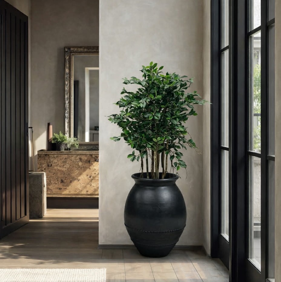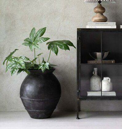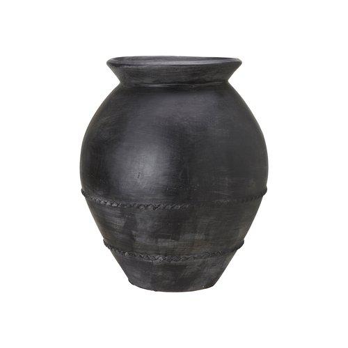 Vacker Vas/Urna/kruka som har en vacker rundad form. Den har en vid öppning och en smalare bas. Ytan är ljus med en textur som ser ut att vara sliten eller patinerad, vilket ger den ett antikt utseende. Det finns två dekorativa band runt urnan, placerade på olika höjder. Färgen är en blandning av ljusa nyanser, vilket ger den ett rustikt och traditionellt utseende. Från svenska varumärket Wikholm form. Storlek: 45X52cm samt Ø22. Material: Terracotta.