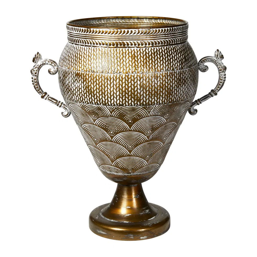 Magnifik stor Pokalkruka eller urna på fot i antikguld med fint sirliga handtag och snygga detaljer. Bedårande att förgylla med blomarrangemang. Passar fint till andra inredningsdetaljer i guld. Webflower har stort sortiment av inredning och roliga detaljer. Material: Metall Storlek:D30x46cm