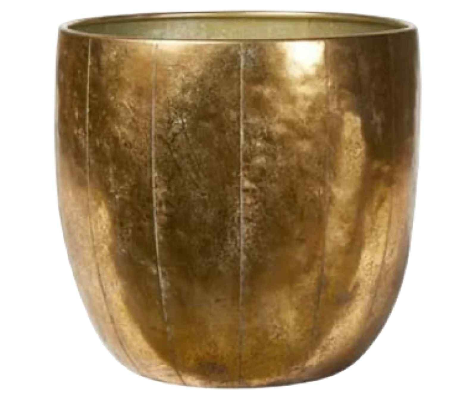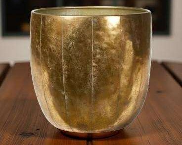 Snygg lyxig kruk i metall i guld. Något glansig kruka som passar på alla ytor. Vi rekommenderar att produkten används inomhus och med en invändig concealer, eftersom kondens kan uppstå. ( fungerar perfekt för konstväxter) Placera inte på ytor som inte tål fukt. Stilren snygg blomkruka i en tidlös guldig färgsättning. Snyggt att dekorera med hemma eller på restaurangen eller snyggt på hotellet. Storlek:33x31cm cm. Material: Metall