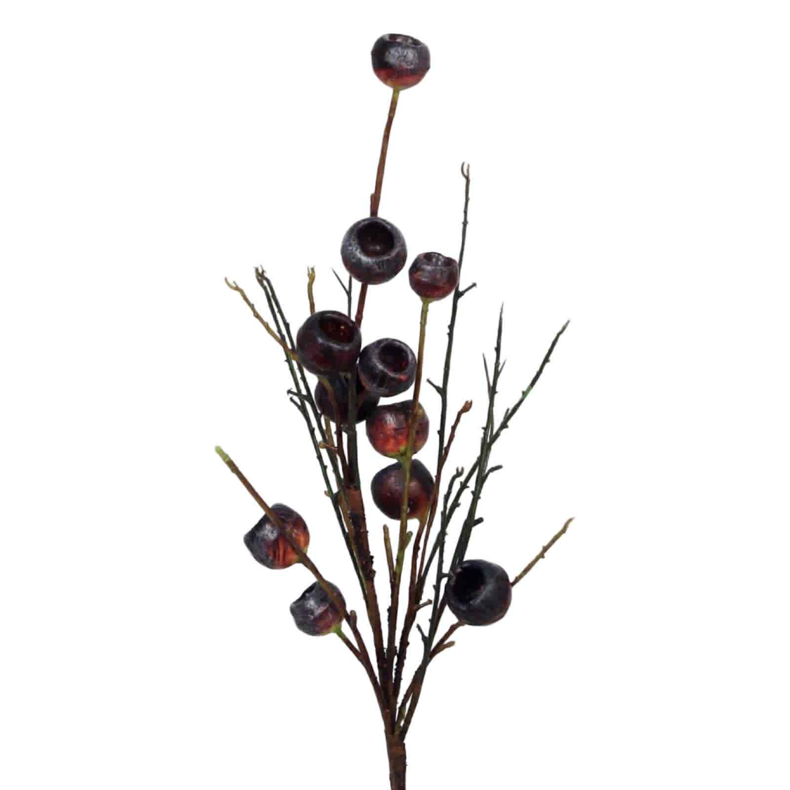 Kvist med flera grenar och runda bär. bären har en mörk färgton och är jämnt fördelade längs grenarna. Den övergripande stilen ger ett naturligt och kanske lite rustikt intryck. Grenarna är smala och sträcker sig utåt från den centrala stammen, vilket ger kvisten en luftig och spröd känsla. Snyggt vid dekoration vid dukning på bord inför sensommar och höst. Denna kvist är 50cm lång. Webflower har stort sortiment av kvistar och andra konstblommor.