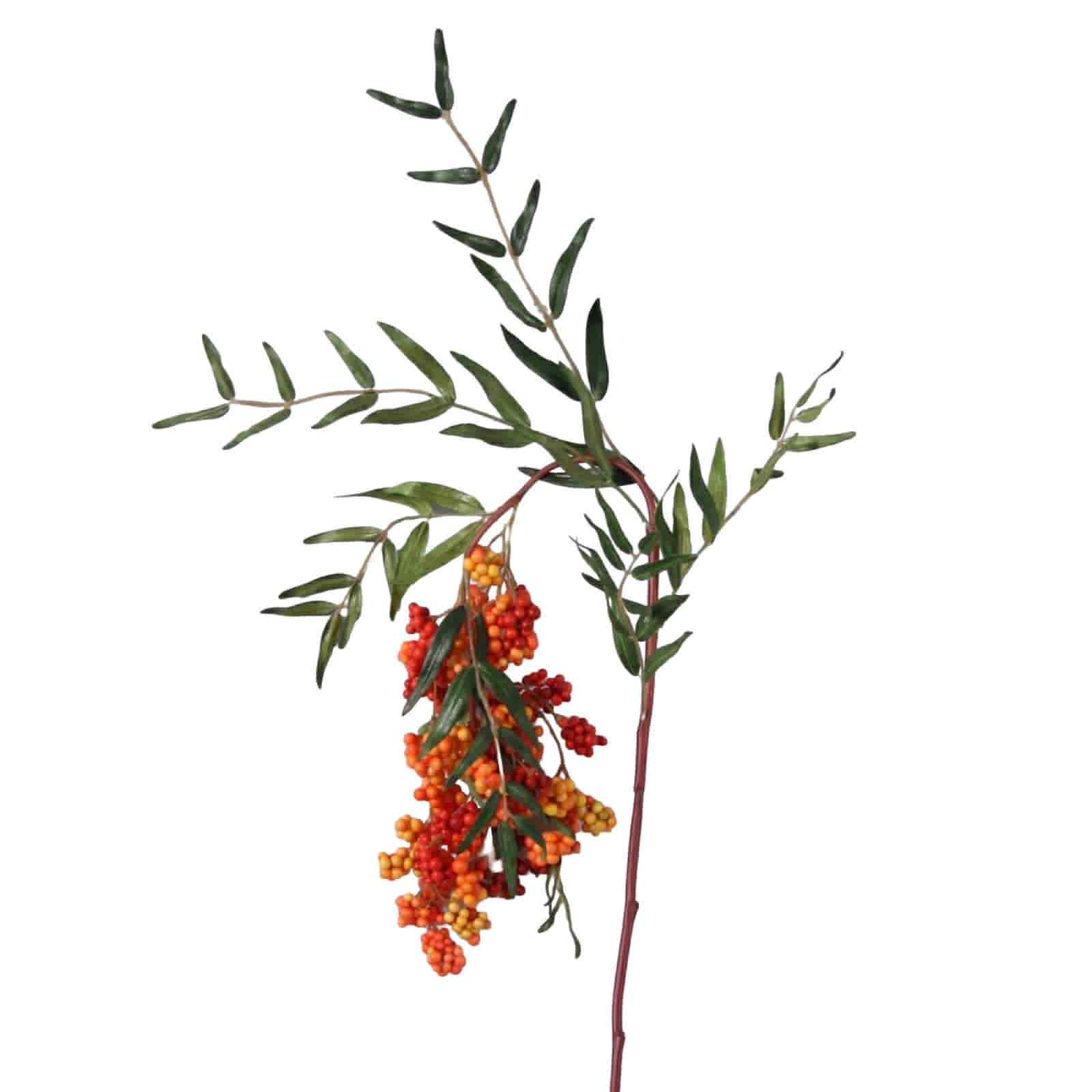 Färgstark pepparkvist. Bladen är smala och avlånga med olika nyanser av grönt för att efterlikna verkliga bladvener och texturer. De sitter spridda längs kvisten och ger ett frodigt intryck. Frukterna hänger i kluster längs kvisten och har en varierande färgpalett som sträcker sig från djuprött till orange och gult. Detta ger ett realistiskt och livfullt utseende. Själva stjälken är flexibel och har en naturlig brun färg, vilket gör det lätt att forma kvisten efter behov. Tack vare sin UV-beständighet är kvisten idealisk för både inomhus- och utomhusdekorationer, och den kan användas i olika arrangemang som buketter eller kransar. Denna kvist erbjuder en underhållsfri skönhet och är perfekt för dem som vill ha ett ständigt grönskande element i sina dekorationer.