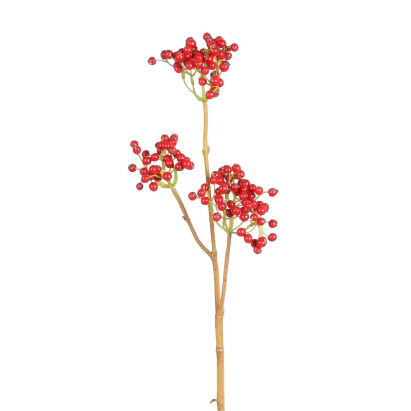 Naturtrogen och konstgjort bärkvist med flera klasar av små, röda bär. Grenen är tunn och brun, med små gröna stjälkar som bären växer på. De röda bären är runda och sitter tätt tillsammans i små kluster. Denna kvist är en härlig dekoration. Snyggt i större vas tillsammans med andra konstgjorda kvistar eller blommor. Eller enbart som singelkvist. Snyggt vid dekoration vid dukning på bord inför sensommar och höst. Denna kvist är 60cm lång. Webflower har stort sortiment av kvistar och andra konstblommor.