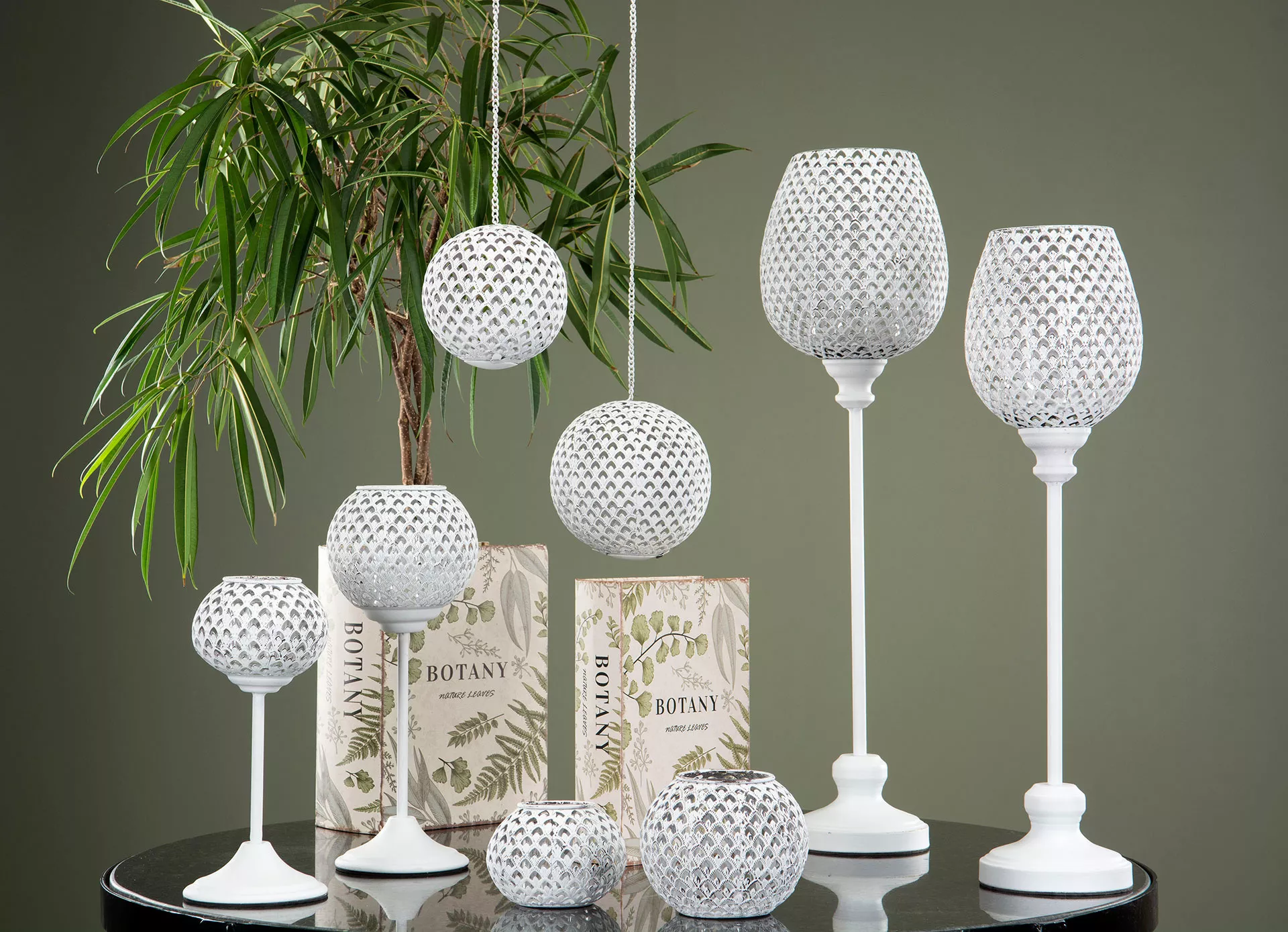 Trevlig och trendig ljuslykta på fot. Dalia ljuslykta är en vacker ljuslykta i vitt i mönstrad metall på fot. I guldbrun färg. Med ett ljus i “ljuskoppen” och lyktan sprider ett härligt sken. Denna vackra lykta är snygg att kombinera med fler. Antingen i samma storlek eller lika lykta i 70 cm hög. Snygg att dekorera med på bord golv. I vardagsrummet, i uterummet eller på terrassen. Snyggt på restaurangen eller i entren på hotellet. Höjd 60cm och Diameter ø 16 cm. Färg: Antik vit. Material: Metall.