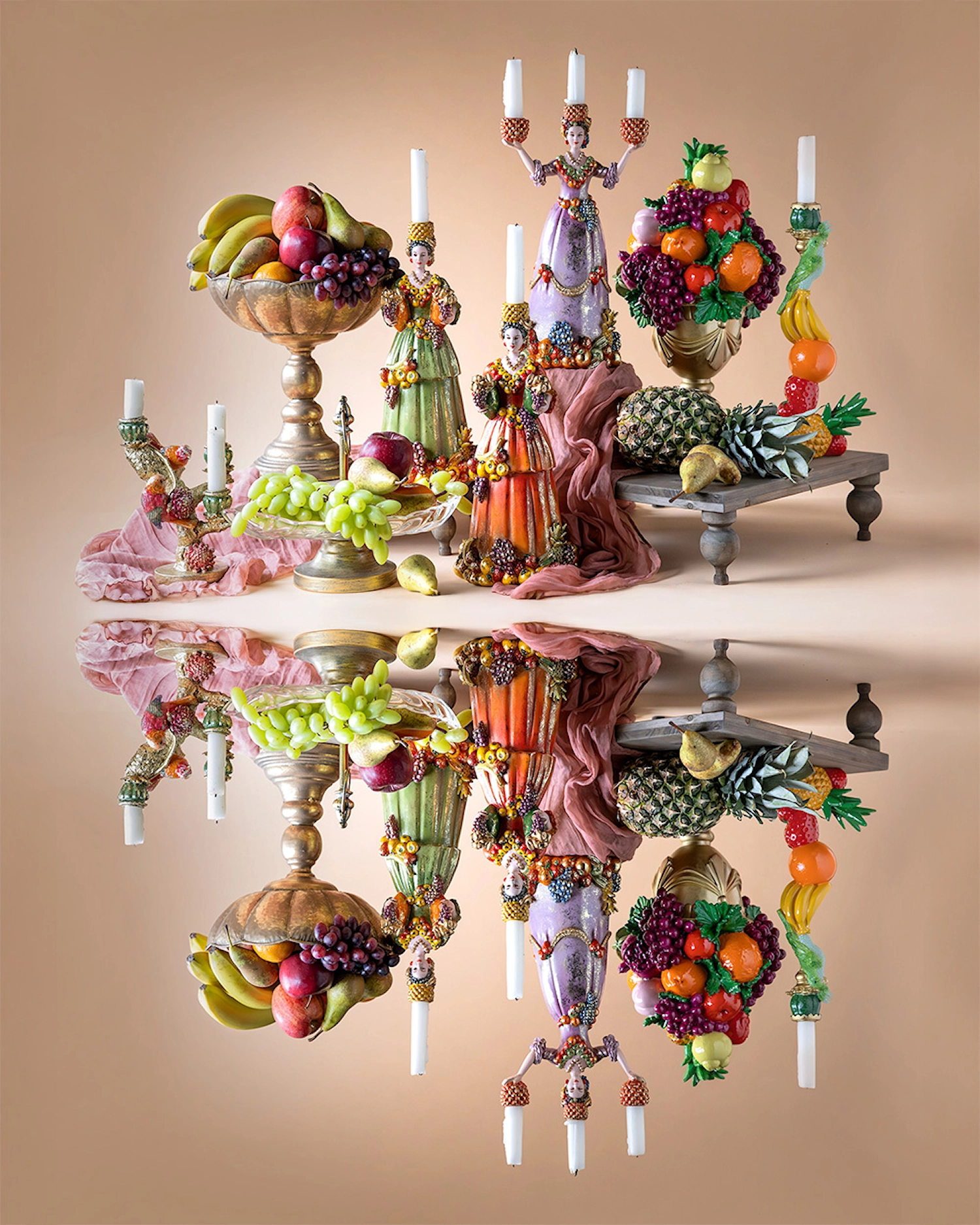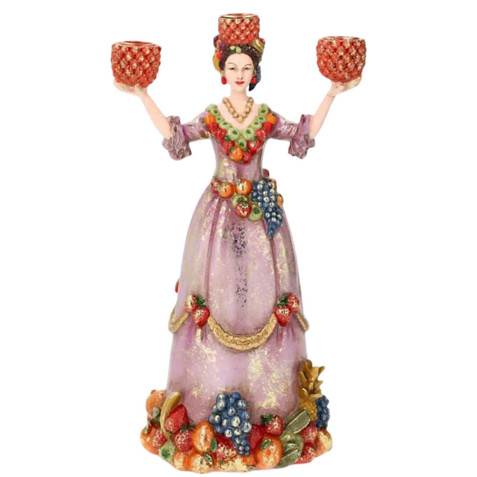 Underbar trearmad ljusstake. Ljusstaken föreställer en kvinna klädd i en klänning. Klänningen har en lila ton och är dekorerad med olika frukter som vindruvor, apelsiner och jordgubbar. Dessa dekorationer ger en känsla av överflöd och rikedom. Kvinnan har en detaljerad frisyr som är utsmyckad med ytterligare frukter, vilket förstärker fruktmotivet. Hon håller två röda ljushållare, en i varje hand, samt en ovanpå huvudet. Dessa ljushållare är mönstrade och designade för att hålla ljus. Basen på figuren är också dekorerad med frukter, vilket ger en sammanhängande design. Denna typ av figur kan användas som en dekorativ prydnad, kanske i ett hem med ett klassiskt eller eklektiskt tema. Material: Poly. Storlek: 23x17x36cm