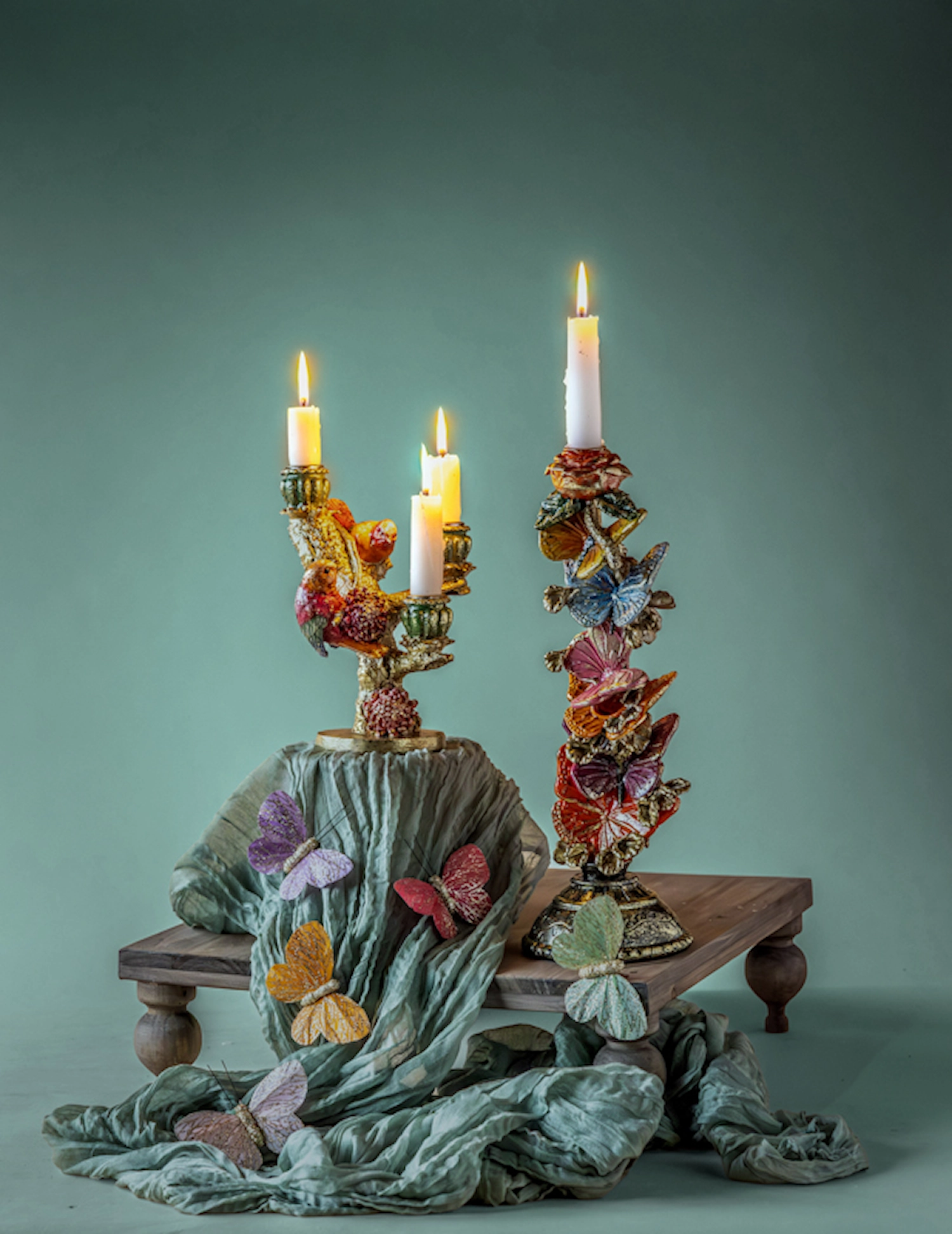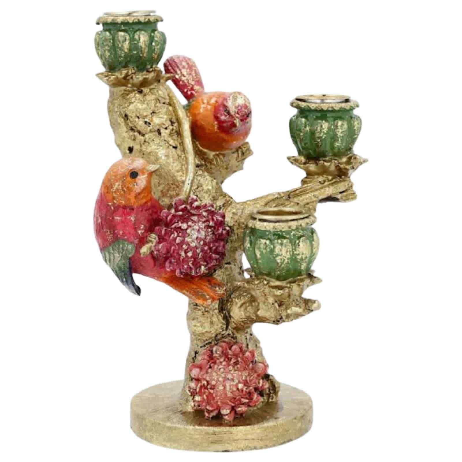 Dekorativ ljusstake. Denna trearmade ljusstake har en iögonfallande design som fångar essensen av ett tropiskt paradis. Ljusstaken är konstfullt utformad med en bas som liknar en robust trädstam, vilket ger en naturlig och organisk känsla. Två exotiska fåglar pryder ljusstaken. En av fåglarna är i en livfull röd och orange ton, vilket ger en känsla av värme och energi. Fåglarnas detaljerade fjäderdräkt och livfulla färger bidrar till en känsla av realism och skönhet. Runt om ljusstaken finns det frodiga blommor i en rik rosa nyans. Dessa blommor verkar nästan som om de spirar direkt från träet, vilket förstärker den naturliga, nästan magiska, känslan av designen. De tre ljushållarna är gröna och har en form som påminner om exotiska frukter eller knoppar. Dessa hållare är placerade på olika höjder, vilket ger en dynamisk och balanserad estetik. Ljusstaken har en gyllene finish som tillför en elegant och lyxig touch. Denna gyllene ton reflekterar ljuset vackert och ger en varm glöd till omgivningen. Denna ljusstake är perfekt som ett dekorativt inslag i hemmet, särskilt för dem som uppskattar en kombination av konst, natur och exotisk charm. Material: Poly. Storlek: 15x12x21cm