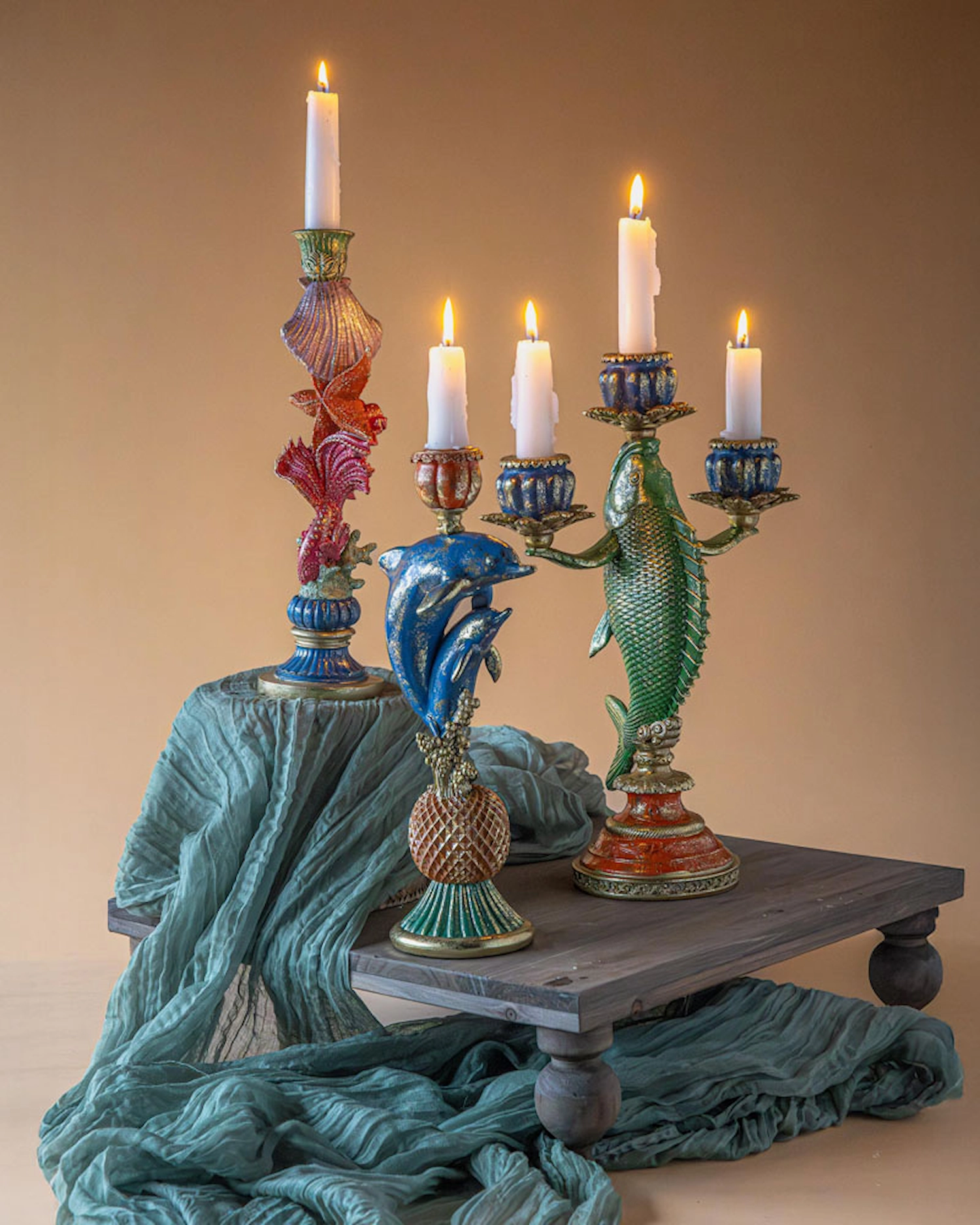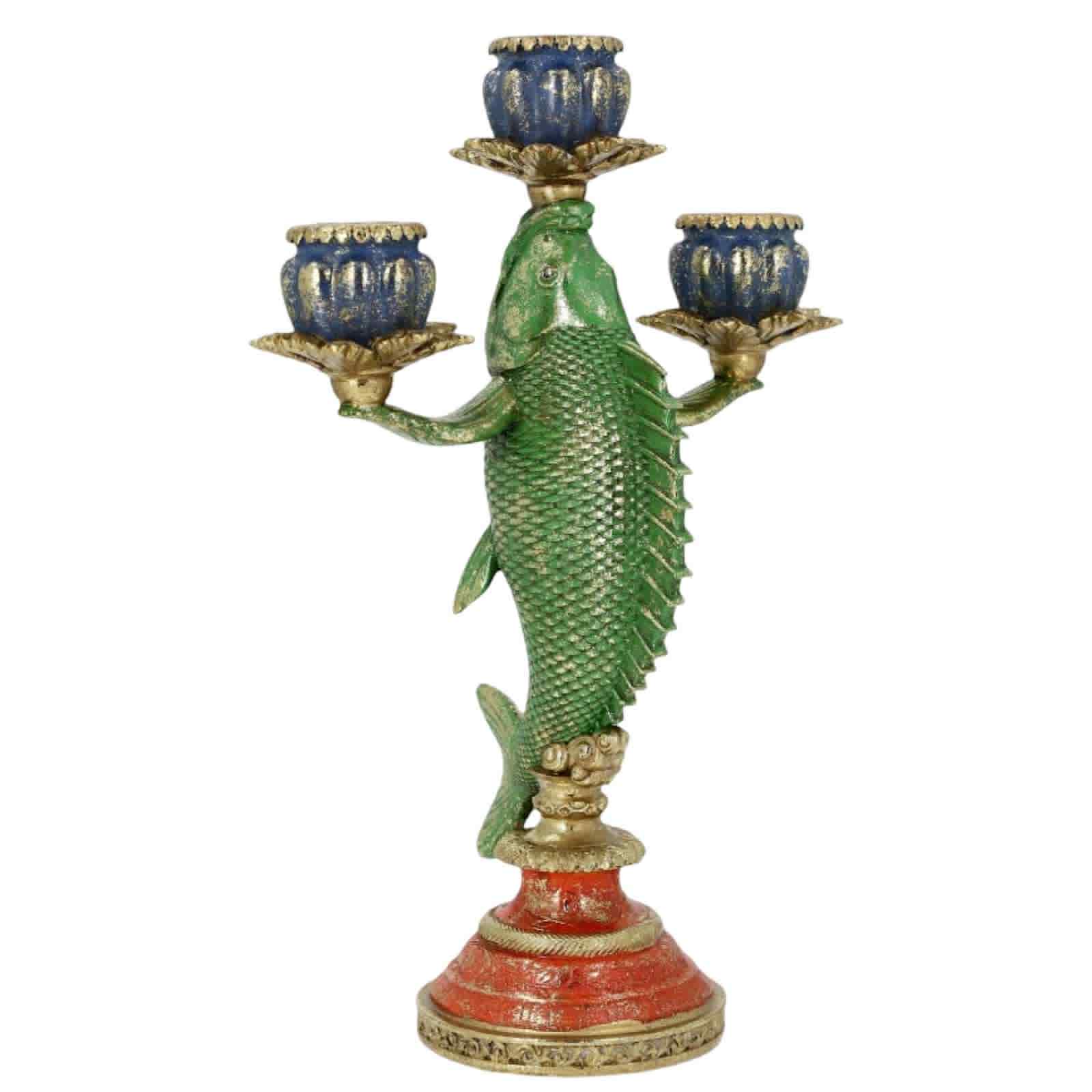 Lekfull ljusstacke med fiskmotiv. Denna ljusstake är en fascinerande och konstnärlig pjäs. Den har tre armar som sträcker sig utåt och uppåt, hållna av en grön fisk. Fisken är detaljerat utformad med fjällstruktur som ger den ett realistiskt utseende. Dess kropp är böjd i en elegant form som ger intryck av rörelse, som om den simmar genom vattnet. Fisken håller varje ljushållare i sina fenor, och dessa hållare är blå med guldiga detaljer, vilket ger en känsla av lyx och elegans. Basen av ljusstaken är dekorerad med rött och guld, vilket kompletterar fiskens gröna färg och ljushållarnas blå nyans. Denna design för tankarna till havet genom fiskens form och färg. Kombinationen av färger och former skapar en nautisk känsla, och hela pjäsen kan ses som en hyllning till havets skönhet och mysterium. Material: Poly. Storlek:20x13x30cm