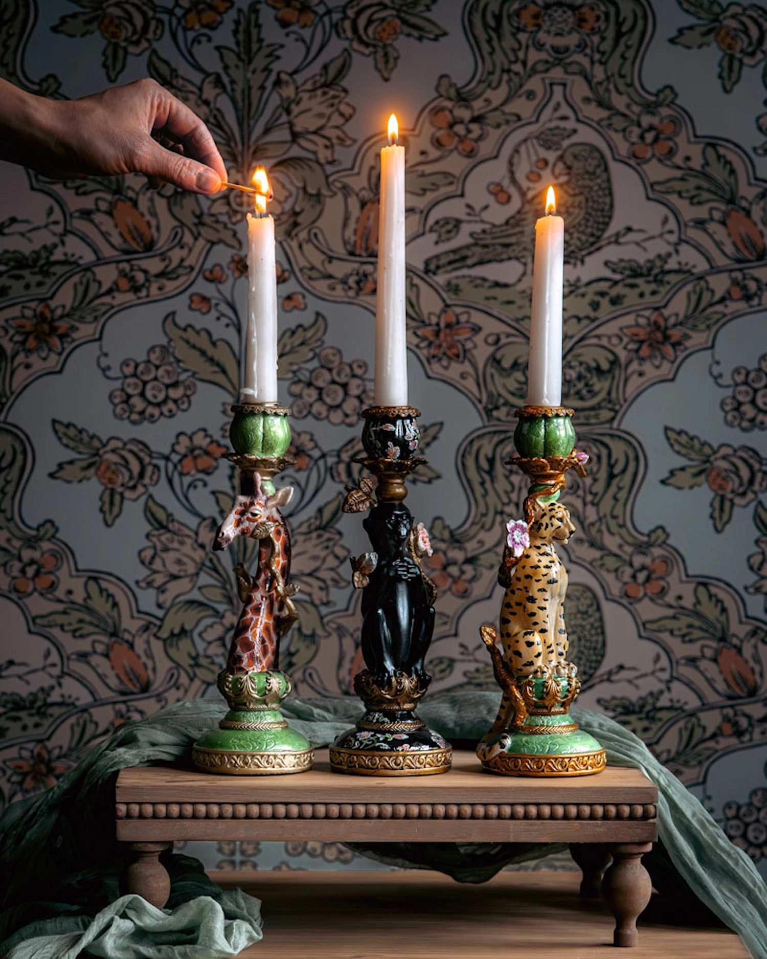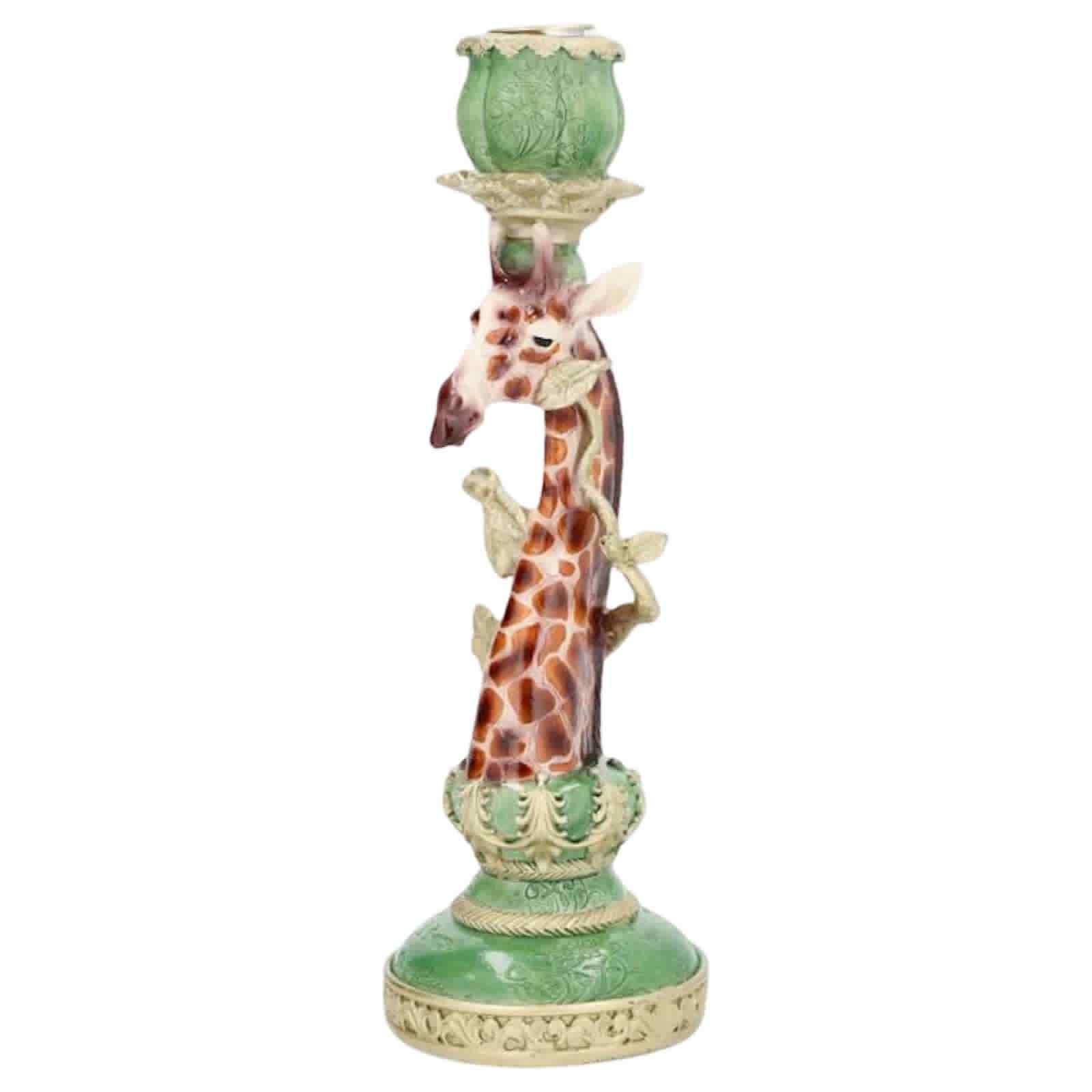 Unik giraff ljusstake Ljusstaken är utformad så att giraffens hals sträcker sig uppåt, och huvudet balanserar den del av staken där ljuset placeras. Basen och ljushållaren är gröna med detaljer i beige. Giraffen är detaljerat målad med naturliga färger, inklusive bruna fläckar och en ljusare nyans för ansiktet. Designen kombinerar konstnärliga och funktionella element, vilket ger en unik och iögonfallande dekoration.. Material: Poly. Storlek:8x8x26cm