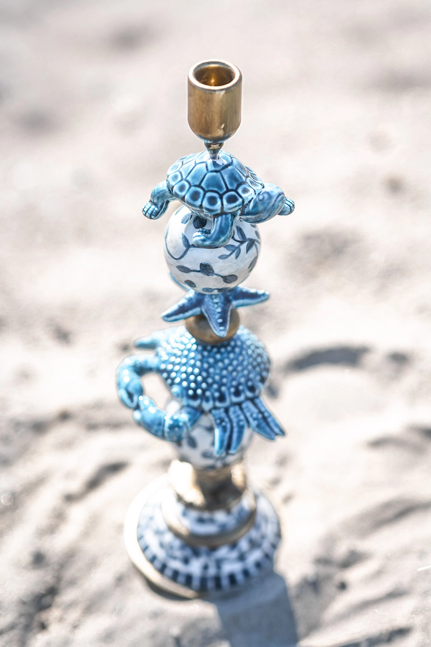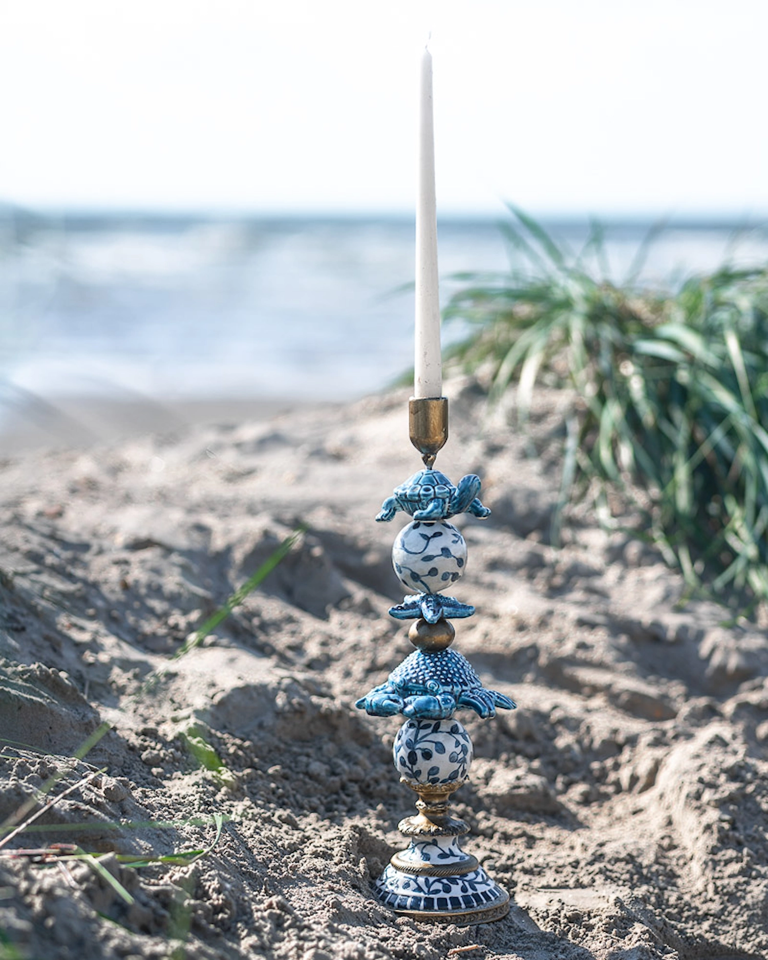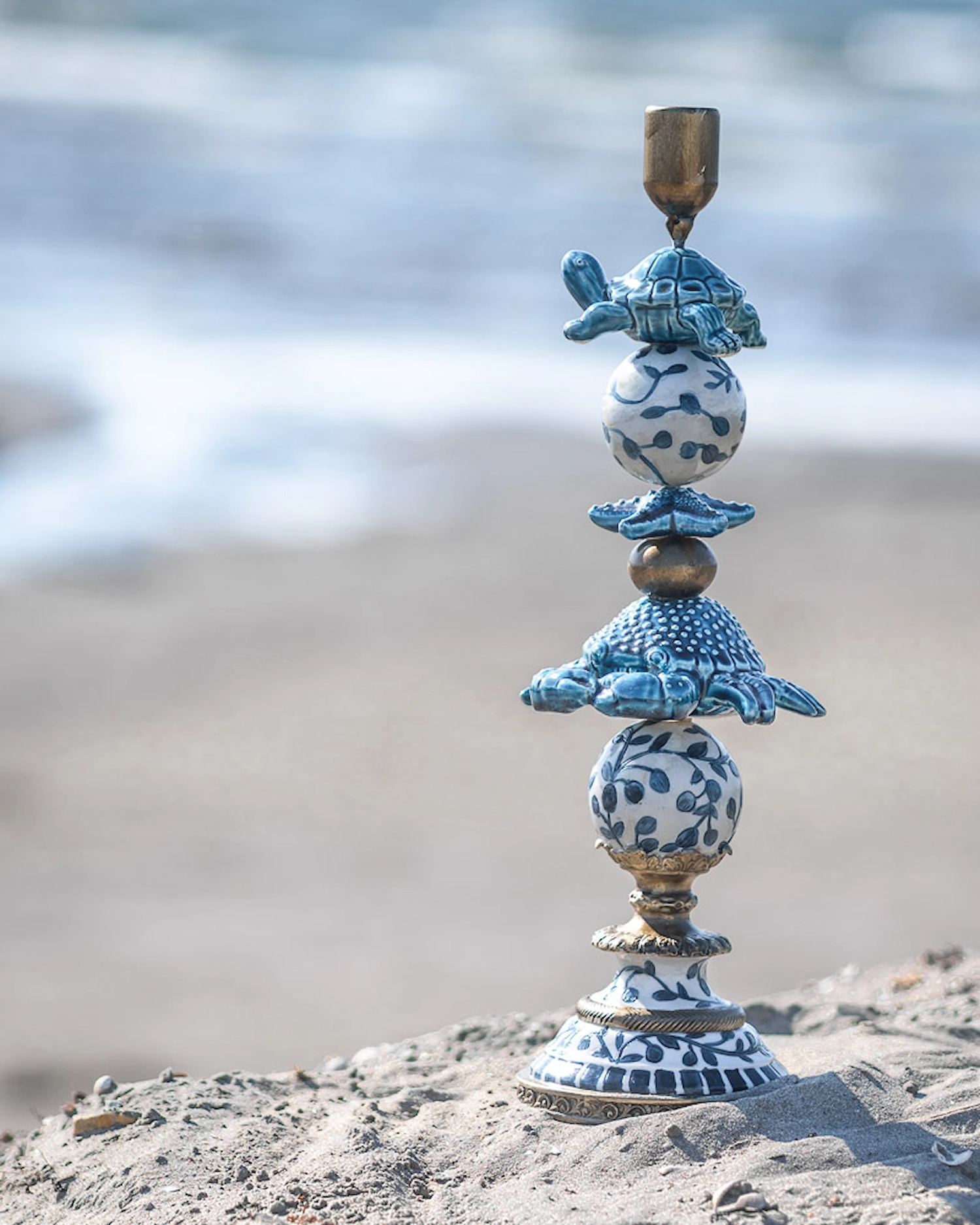Denna ljusstake är som en dröm från havet, där varje detalj viskar om solkyssta stränder och saltstänkta vindar. Den är dekorerad med sköldpadda, sjöstjärna och en krabba som ger känslan av att de simmar över en vit porslinsyta med djupblå mönster, som påminner om böljande vågor och sjögräs som dansar i tidvattnet. Ljusstakens form speglar en somrig dag vid kusten, där den blå färgen för tankarna till det oändliga havet och den gyllene tonen i ljushållaren fångar solens varma strålar. De eleganta detaljerna av blad- och snäckliknande former ger en känsla av att vara nära det marina livet, som att gå barfota längs strandkanten och känna sanden mellan tårna. Denna ljusstake är inte bara en ljuspunkt i rummet, utan en portal till en värld av sommarminnen och havets lugnande närvaro. Material: Poly. Storlek:13x12x40cm