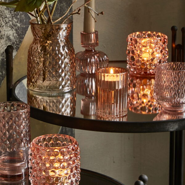 Här har vi en liten ljuslykta eller en glasbehållare med bubbligt mönster. Cylindrisk form och ytan är täckt med ett upphöjt bubbelmönster, vilket ger en texturerad och dekorativ effekt. En klar lykta vilket ger en subtil och elegant ton.