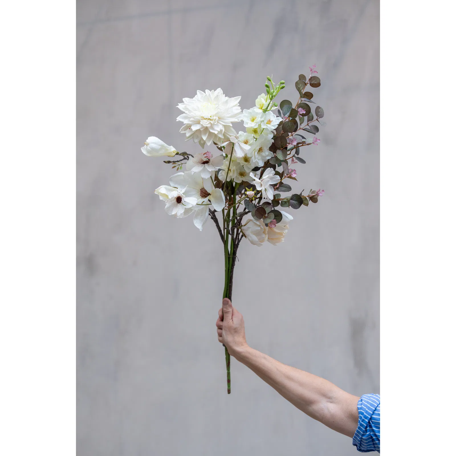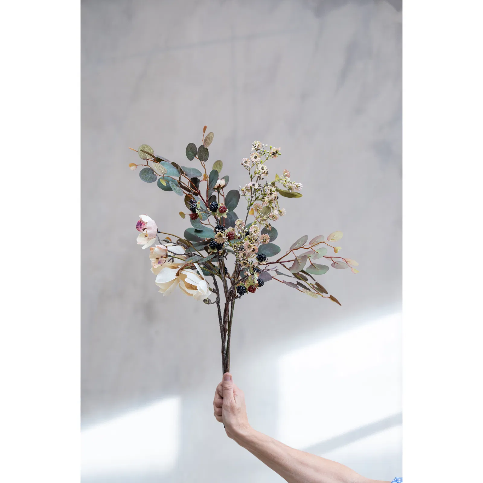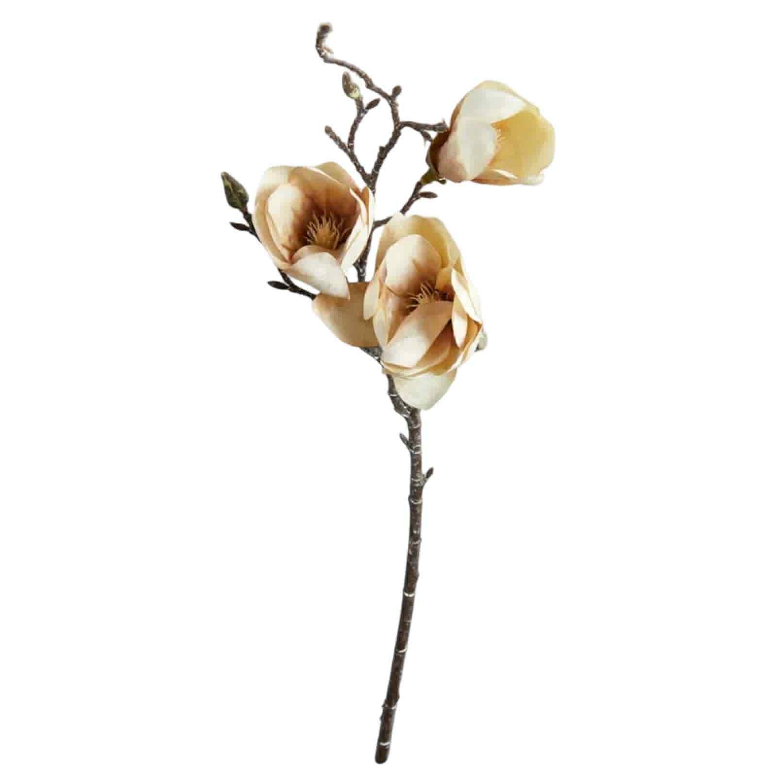 Praktfull magnolia.  magnolian är en gren med tre utslagna blommor, vars kronblad är mjuka och krämfärgade med en subtil övergång till en djupare, nästan gyllene ton mot botten. Blommorna har en elegant, skålformad struktur som varsamt omfamnar de delikata ståndarna i mitten, vilka liknar små solstrålar som sträcker sig utåt. Grenen, med sin slanka och något vridna form, bär på knoppar som lovar nytt liv och påminner om vårens ankomst. Dess bark är mörk och texturerad, vilket skapar en vacker kontrast mot de mjuka blombladen. Den övergripande känslan är en av elegans och skönhet, där varje blomma tycks sväva nästan viktlös, fångad i ett ögonblick av tidlös harmoni. Storlek: 50cm