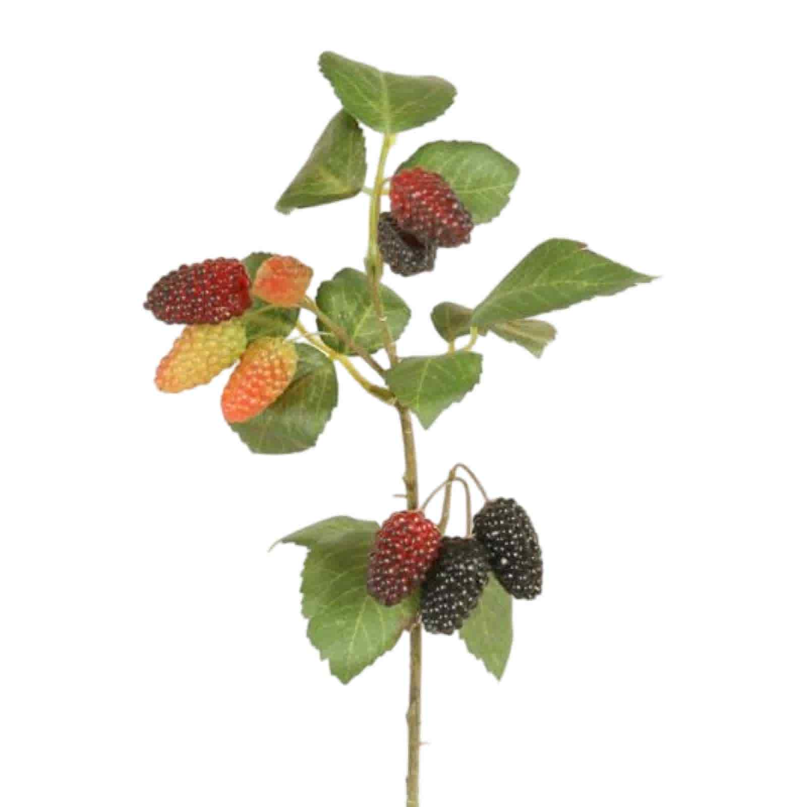 Naturtrogen och konstgjod mullbärskvist. Kvisten är med mogna och omogna mullbär. Mullbären varierar i färg från grönt till rött och mörklila, vilket indikerar olika mognadsstadier. Kvisten har flera gröna blad med tydliga vener. Mullbären är avlånga och ser saftiga ut, vilket är typiskt för mulberry-träden. Bladen är tillverkade i tyg. Bladen är UV-beständiga. Detta innebär att bladen kan stå emot solens UV-strålning under en längre tid och därmed håller färgen bättre än andra produkter. De tål även vatten. Snyggt på altanen, terrassen , vid grillen eller vid buffén på restaurangen. Snygg dekoration.