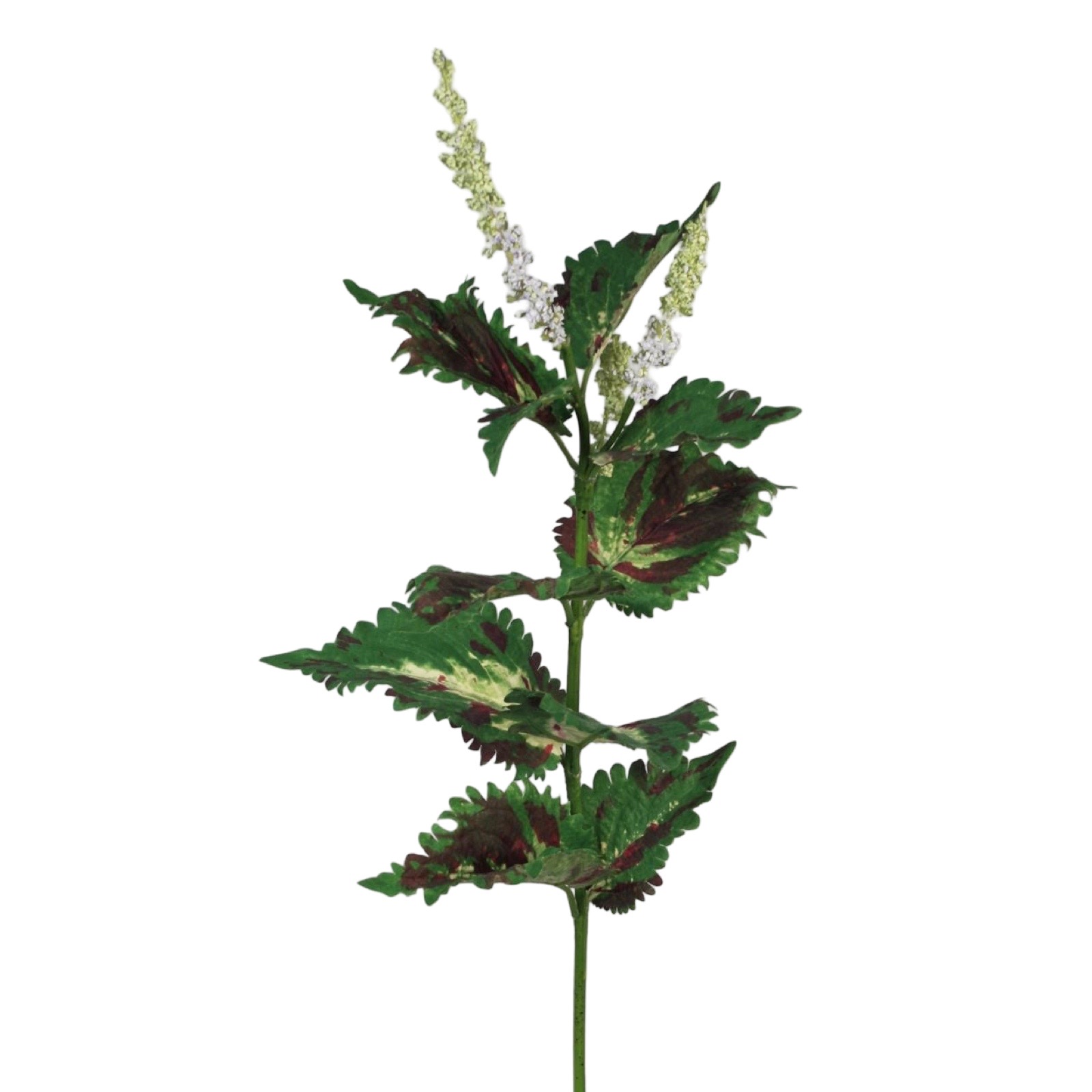 Vacker nässla. Bladen är gröna med inslag av mörkare, nästan vinröda nyanser, vilket ger dem ett levande och naturligt utseende. Blomknopparna är vita och sitter på små stjälkar som sticker ut från huvudstammen. Stammen är rak och grön, vilket förstärker det naturliga intrycket av växten.