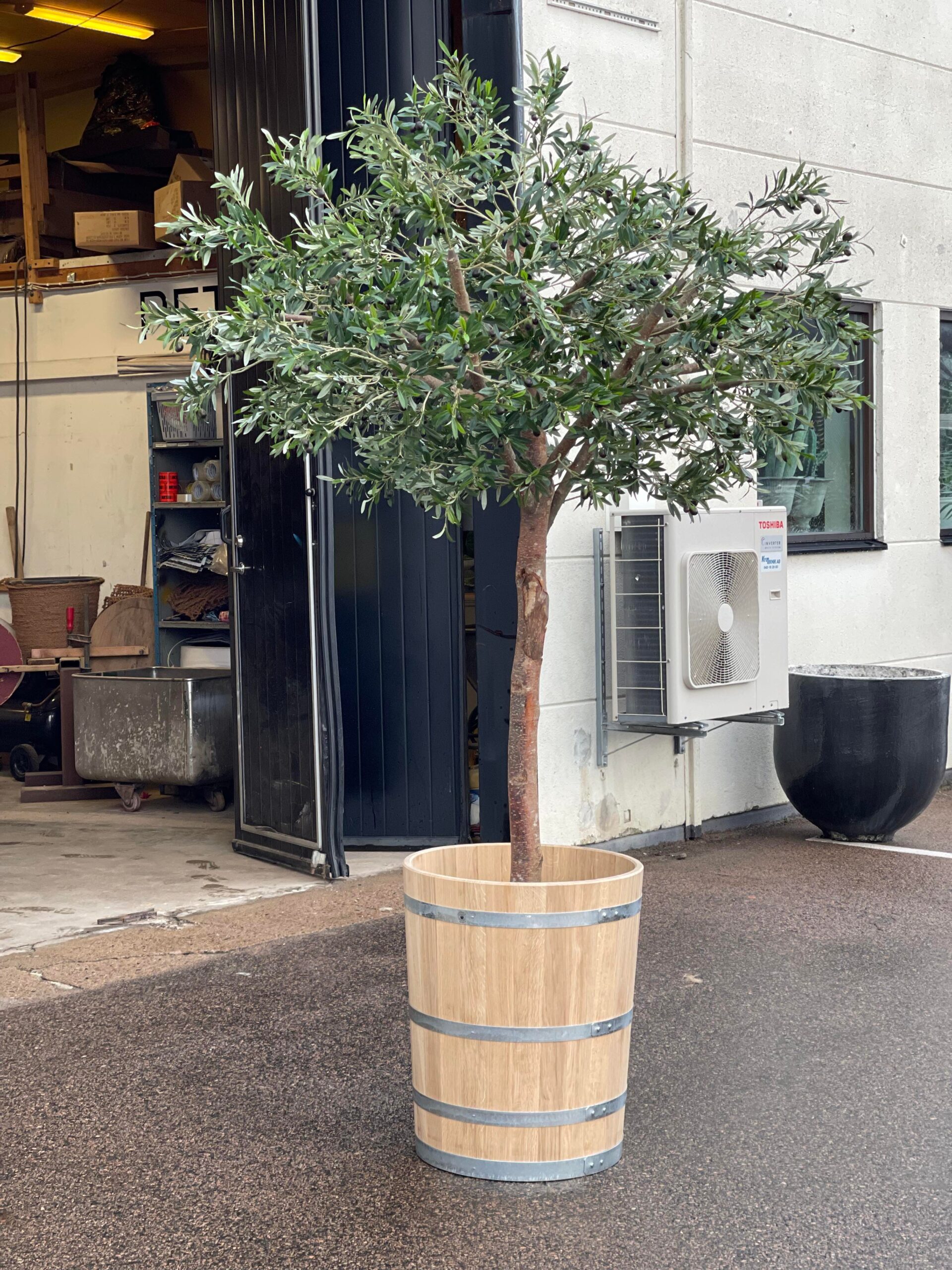 Trädet monteras och betongas i en stabil svart innerkruka för bästa stadga. Du placerar enkelt innerkrukan i större ytterkruka efter önskemål. Önskar du annan storlek? Vi bygger olivträd i flera höjder och former. Be om offert så tar vi fram rätt modell för ditt projekt.