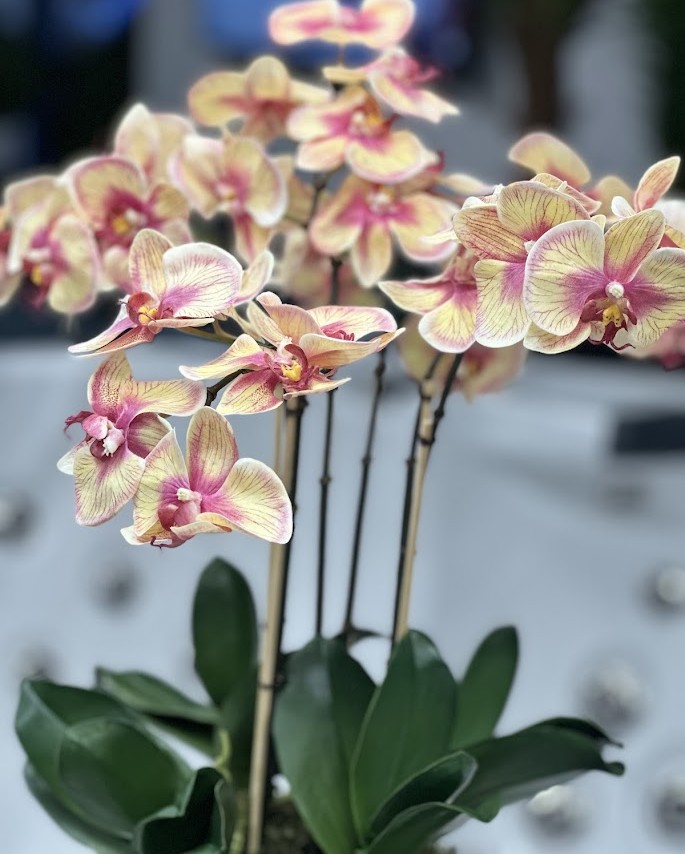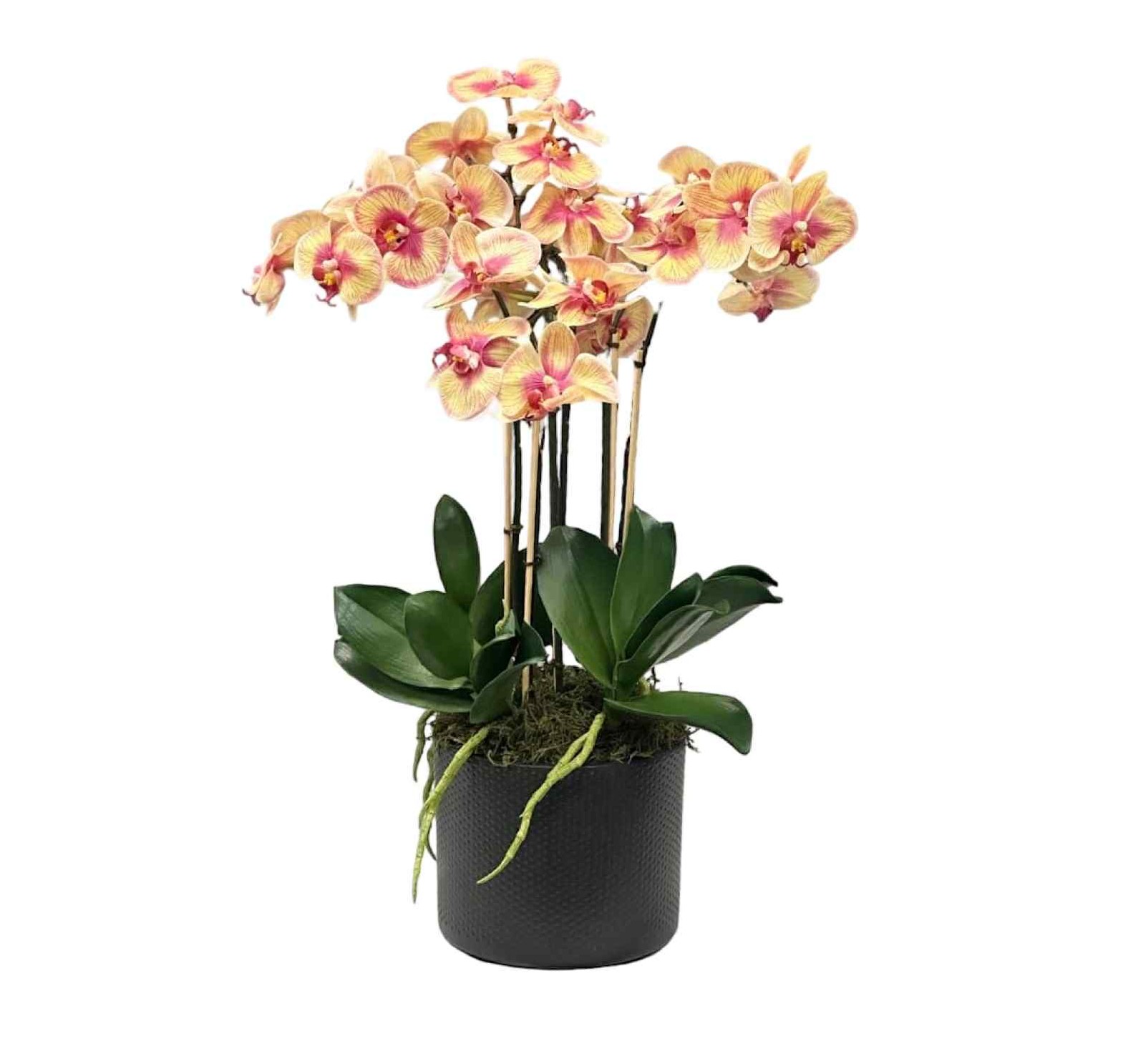En elegant och tidlös orkidé som lyfter känslan i vilket rum som helst. Denna modell har naturtrogna blommor i mjuka toner av gul/aprikos med vackra rosa inslag som ger ett exklusivt och levande uttryck. De breda, djupt gröna bladen skapar en fin kontrast mot blomningen och bidrar till ett lyxigt, balanserat helhetsintryck. Orkidén är monterad i en stilren svart kruka som passar perfekt i moderna miljöer – allt från hotellobby och kontor till restaurang, butik eller hem. Varje arrangemang byggs för hand av Webflower vid beställning för bästa finish och ett professionellt slutresultat. ✅ Höjd: ca 55 cm. Monterad i svart kruka. Byggs vid beställning av Webflower. Naturtrogen & underhållsfri – alltid lika vacker.