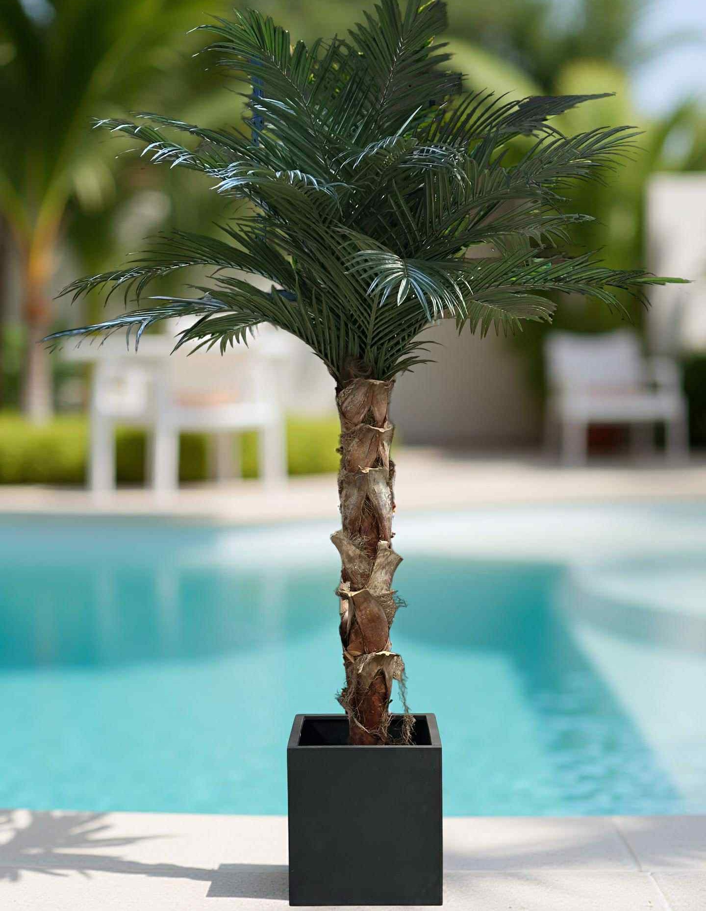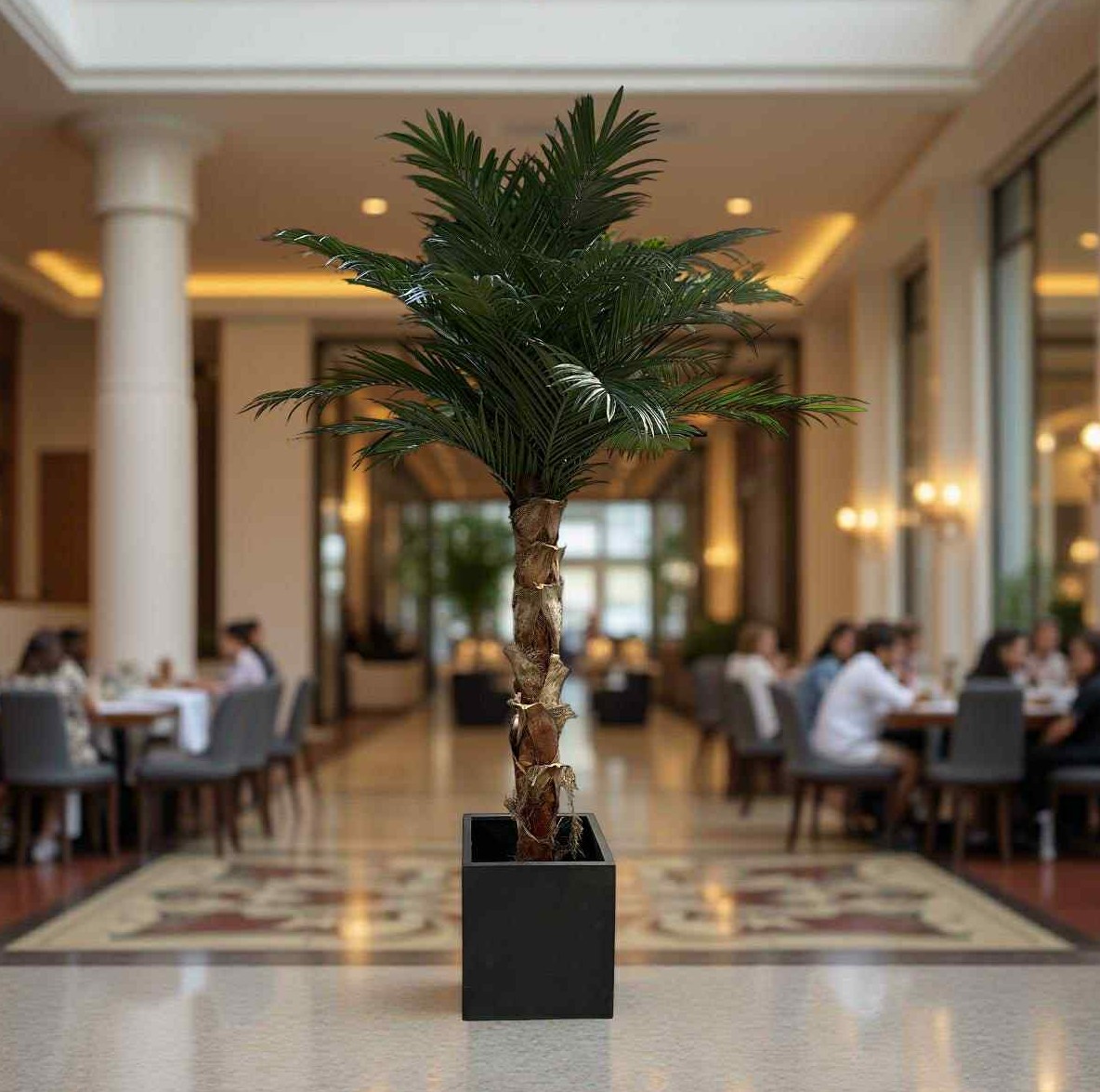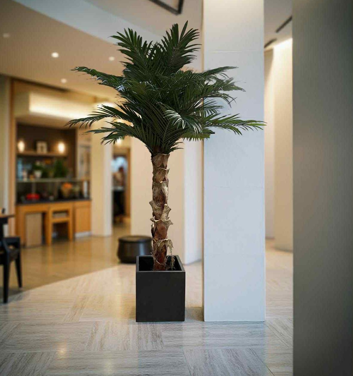 De tål dessutom vatten och är därför väl lämpade för både inom- och utomhusmiljöer. Stammen är ca 10 cm i diameter (något grövre stam) och är klädd med äkta palmfibrer, vilket ger ett mycket realistiskt och exklusivt utseende. Denna naturtrogna palm skapar en harmonisk och inbjudande miljö och passar utmärkt i offentliga miljöer, uterum, entréer, spa- och poolområden, runt bubbelbad eller på terrasser.