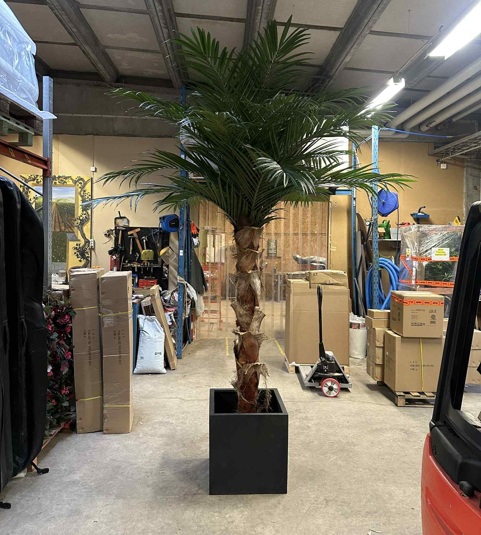 I detta utförande levereras palmen i en stor svart Cube-kruka, 55 × 55 × 55 cm