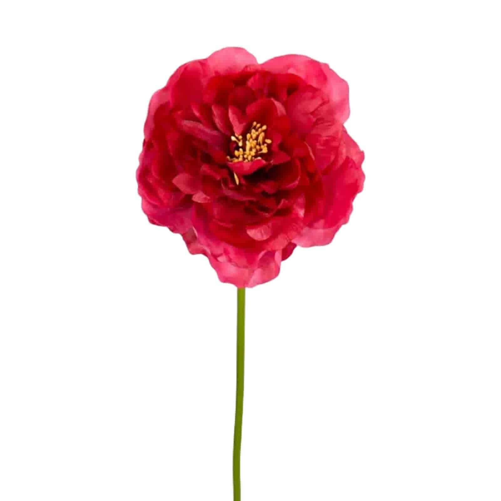 Praktfull pion. Pionen har en klassisk, rundad form som karaktäriseras av sina många lager av kronblad. Dessa lager ger blomman en fyllig och frodig look. – Kronbladen är arrangerade tätt, vilket skapar en känsla av djup och dimension. Blommans kronblad har en rik, djup rosa färg som är både levande och elegant. Denna nyans ger en känsla av romantik och skönhet. – Texturen på kronbladen är mjuk och silkeslen, vilket ger ett realistiskt utseende. De tunna kanterna på varje kronblad fångar ljuset och skapar subtila skuggningar. I mitten av blomman finns små, delikata ståndare som tillför en kontrasterande gul färg. Dessa detaljer ger pionen en känsla av realism och kompletterar dess övergripande estetik. Stjälken är grön och smal, vilket balanserar den frodiga blomman ovanpå. Dess enkelhet lyfter fram blommans elegans utan att ta bort fokus från den. Denna konstgjorda pion är ett vackert exempel på hur en enkel blomma kan förvandlas till ett konstverk som fångar ögat och ger en känsla av tidlös skönhet Den konstgjorda pionens skönhet ligger i dess förmåga att efterlikna naturens egen elegans, vilket gör den till en tidlös dekoration som aldrig vissnar. Snygg tillsammans med andra konstgjorda blommor eller bara Pion i egen glasvas. Storlek: 46cm.